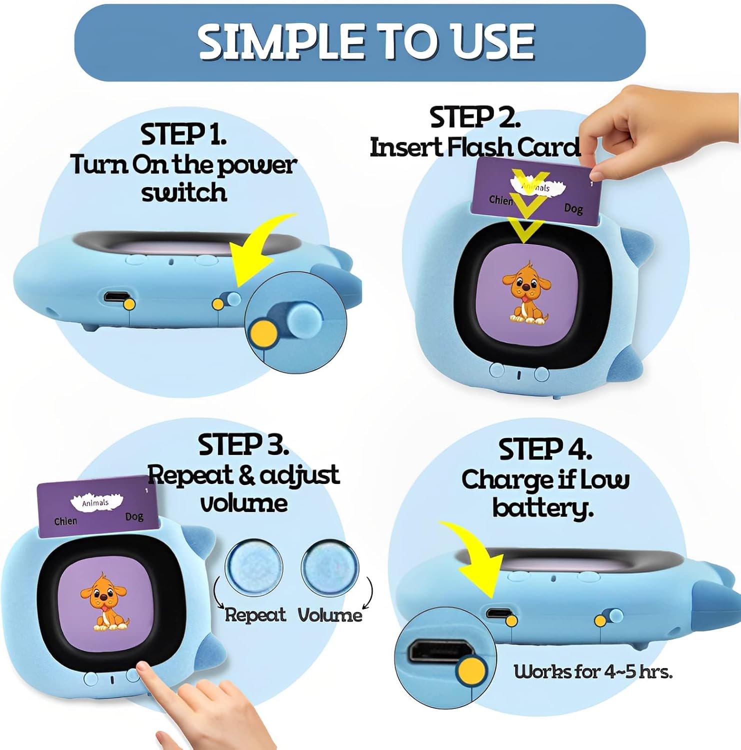 - Easy to Use and Rechargeable - Our educational flash cards is user-friendly. Just insert cards into the reader slot for instant pronunciation in French or English. It features a repeat button, adjustable volume, and a rechargeable battery via USB.