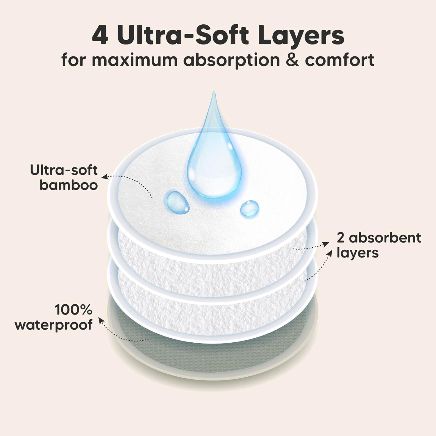 - Great For Leakages – Leakage is a thing of the past with our 4-layer nursing pads. KeaBabies Nursing Pads feature three layers of ultra-absorbent viscose derived from bamboo, sealed with a protective waterproof outer layer for extra security on the nipple pads. Tip: If you experience a heavy flow, please replace breast pads every 5-6 hours.
