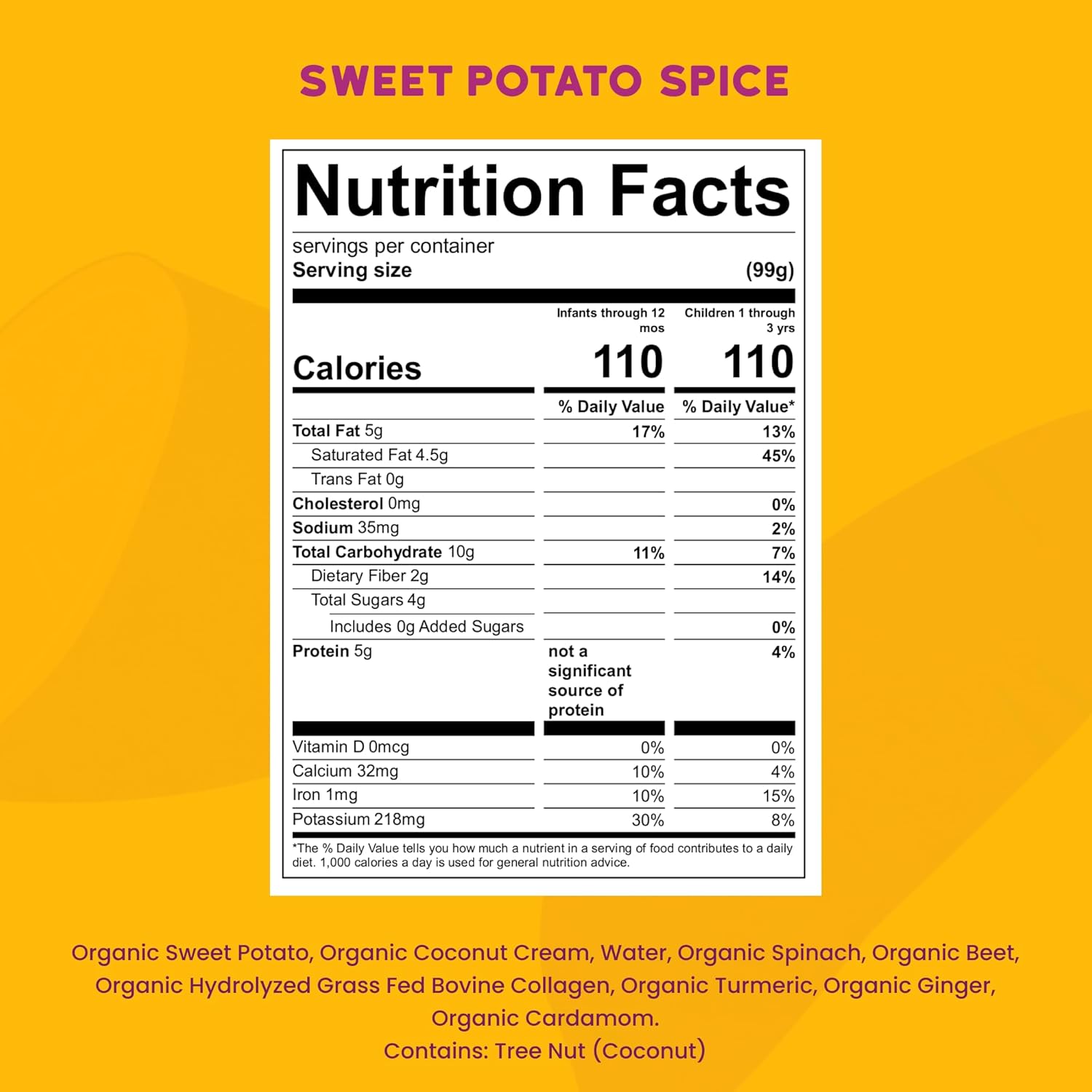 Serenity Kids 6+ Months Dairy-Free Smoothie Baby Food Pouches - USDA Organic, Grass Fed Collagen Protein - 3.5 Oz BPA-Free - Sweet Potato Spice - 6 Count - Smoothie Pouches