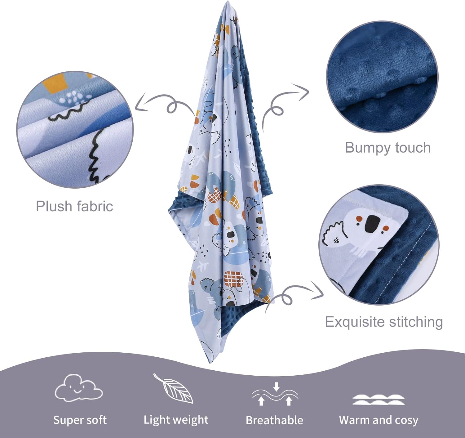 - 1.【Warm & Cosy】We use super soft minky fleece. Double-sided reversible design offer you different soft with one side of smooth and 3D dotted to the other. Light and breathable, warm and cosy,like mother's touch,will help calm little ones. Treat children to restful naps and cozy nights. suitable for baby boy or baby girl.