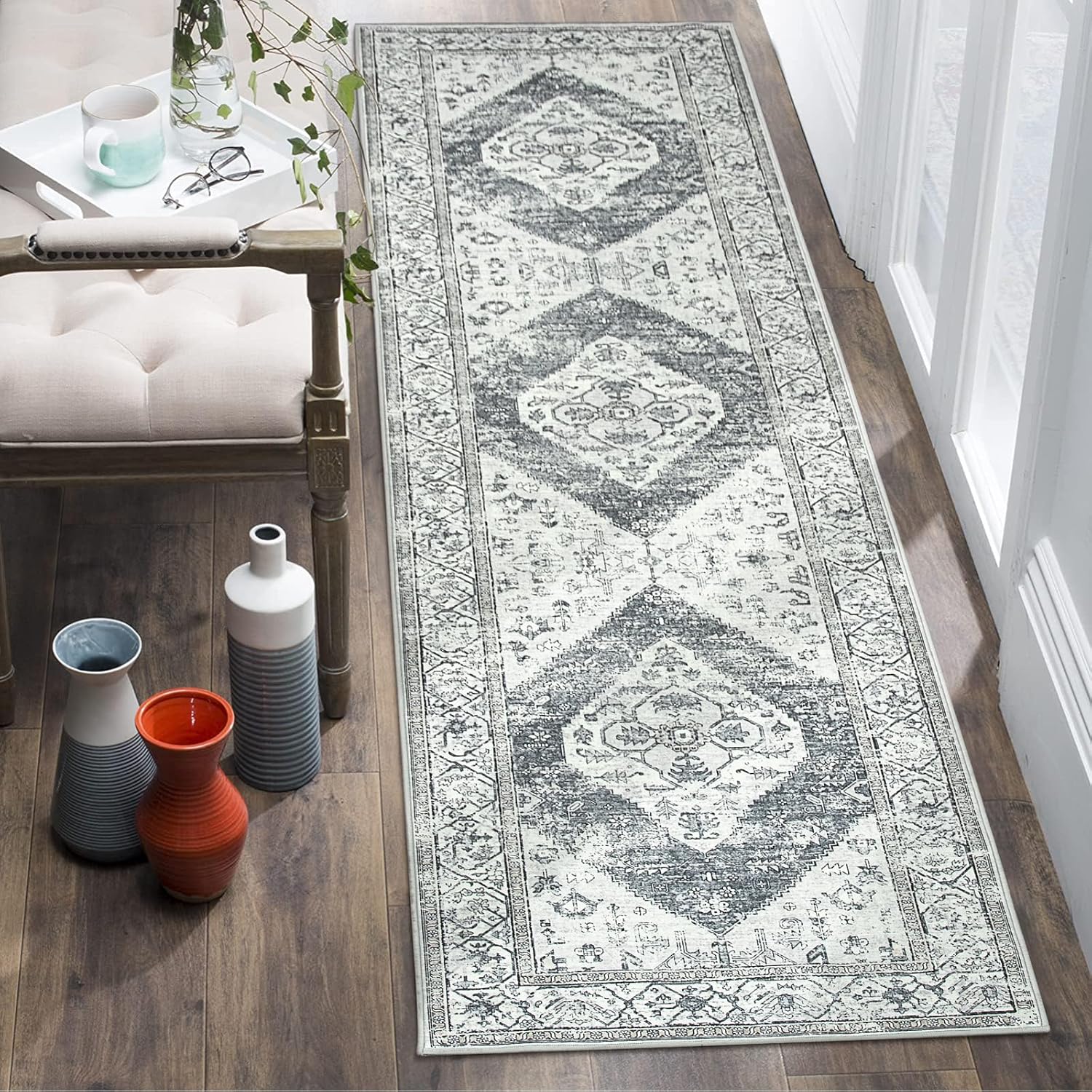 Lahome Boho Hallway Runner Rug 2x6, Washable Untra-Thin Non-Slip Kitchen Runner, Oriental Distressed Print Rug for Entryway Bathroom Laundry Room Bedroom, Grey