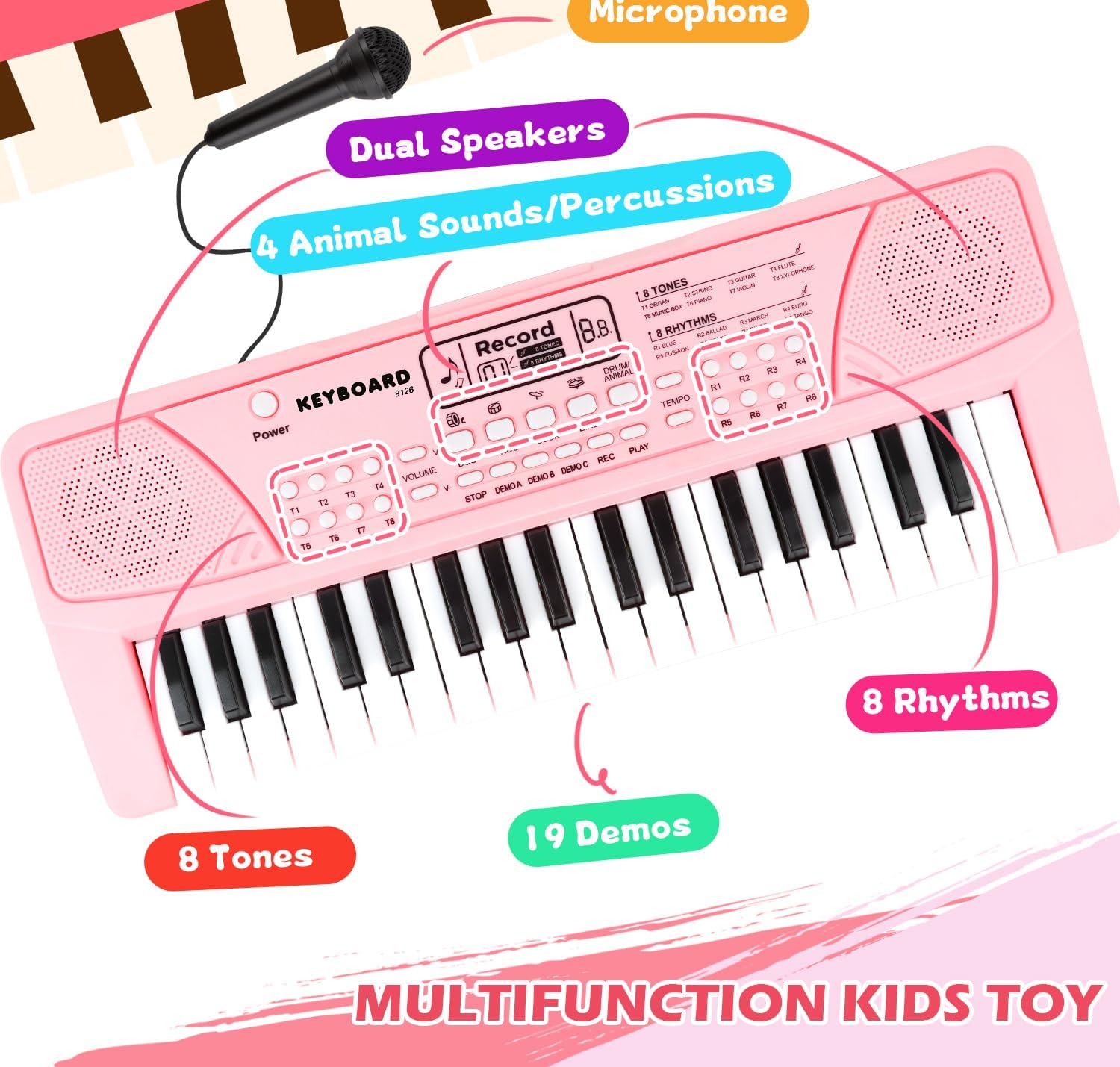 M SANMERSEN Kids Piano Keyboard with Microphone 37 Keys Portable Electronic Keyboards for Beginners Musical Toy for 3/4/5/6 Year Old Girls Boys, Pink