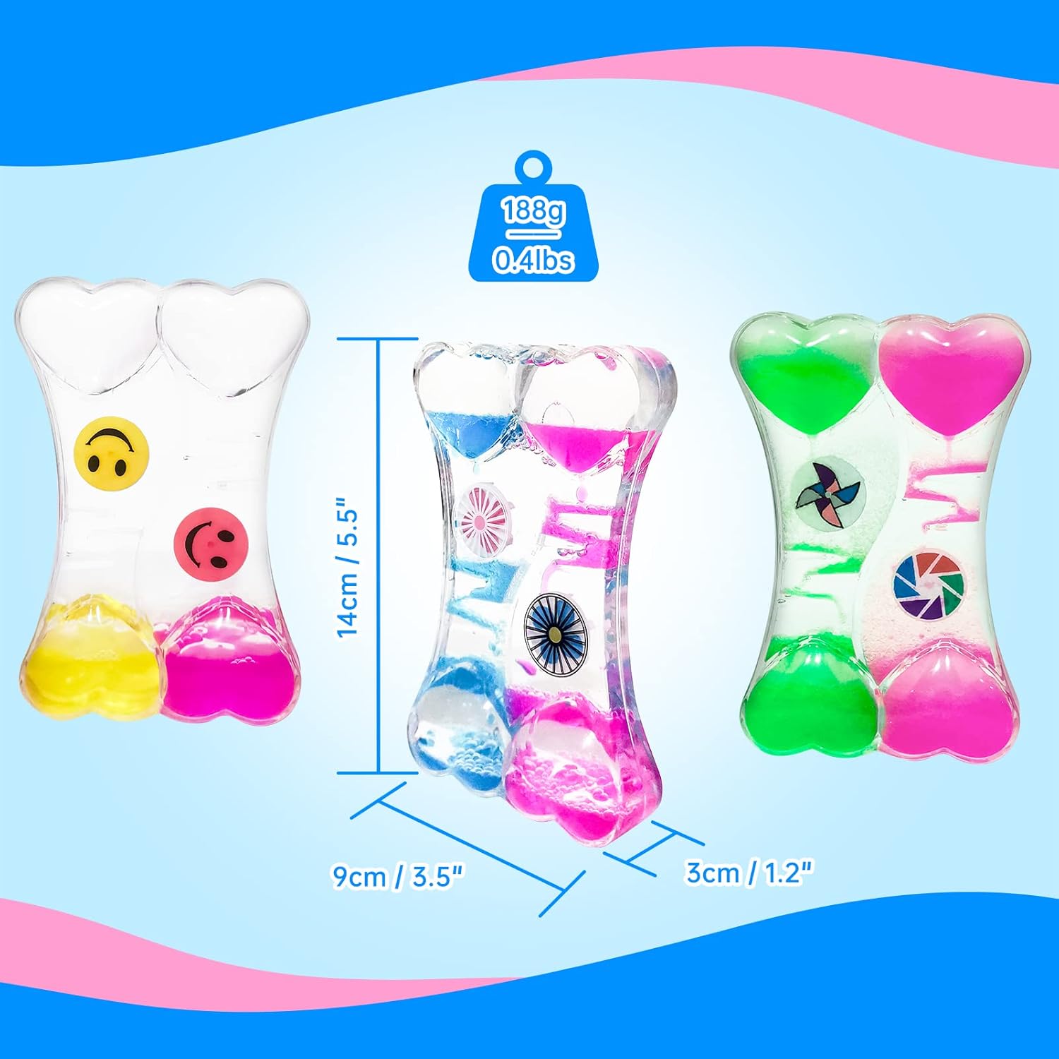 - 【Liquid Timer Sensory Toy for Relaxation】Simply flip double heart shape water timer fidget toy, The liquid inside will drive the windmill to rotate continuously. again and again! these liquid motion bubblers will actively work to relieve your stress, and provide you with hours of calming entertain ment at home or even at the office.
