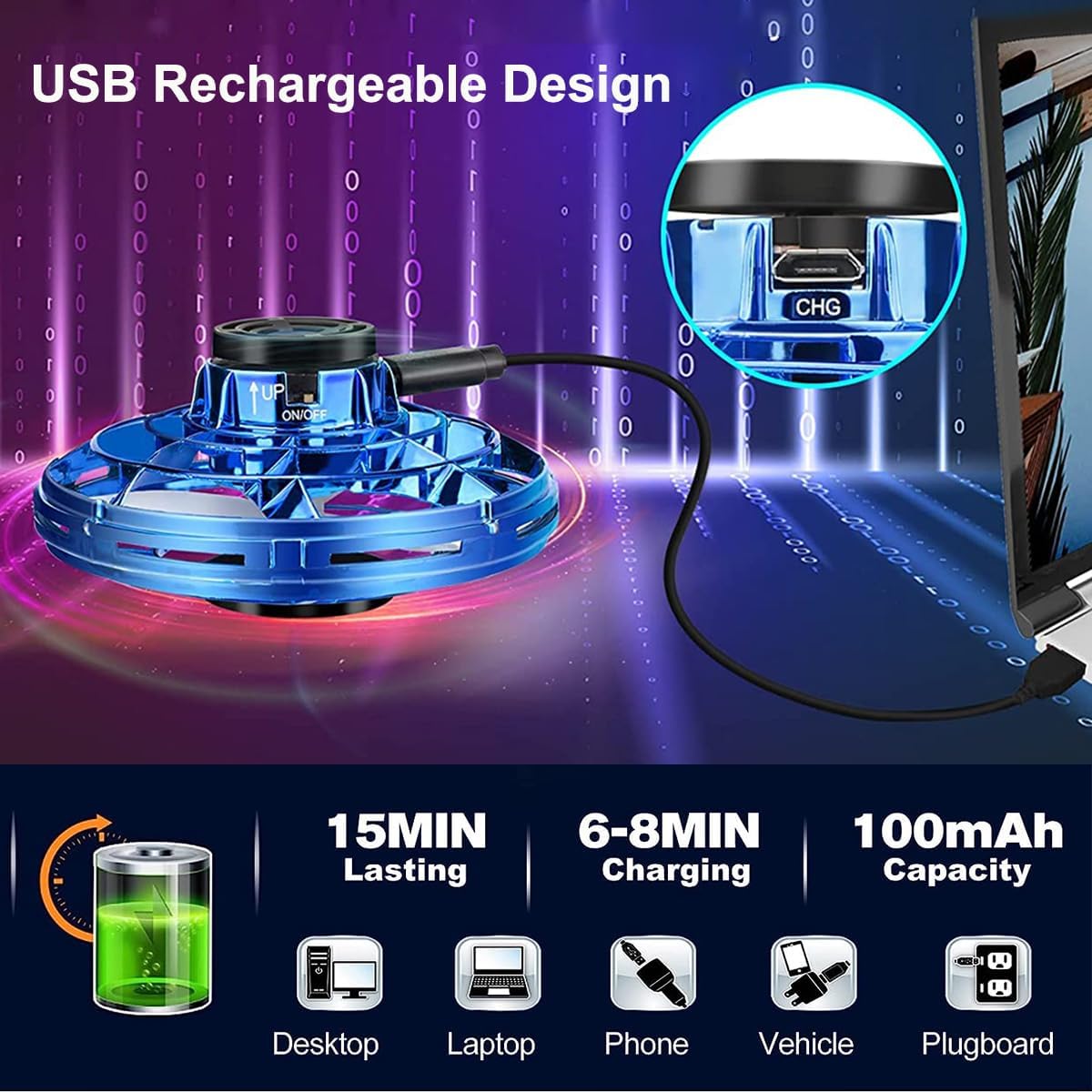 - USB Charging & Portable - This UFO flying toy is fully charged in about 15 minutes. Work 8-10 minutes. Support multiple charging methods such as computer, adapter (please do not use quick charger), power bank, etc. When the LED indicator flashes, it means the aircraft needs to be charged. The light stays on during charging and turns off when charging is complete. This compact drone is easy to carry whether you put it in your pocket or hold it in your hand.