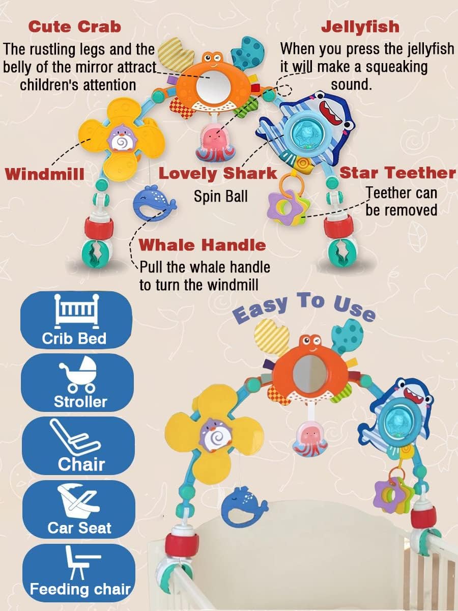 - Carseat toys for infants 0-6 months,Stroller toys have variety of graphics,Penguin Windmill.Whale Handle.Star teether.Cute crab have rustling legs and the belly of the mirror attract children's attention.Bullt-in BB squeaker in the Jellyfish press to make a Bi~ Bi~ sound.Lovely Shark colorful rotating ball rattle.
