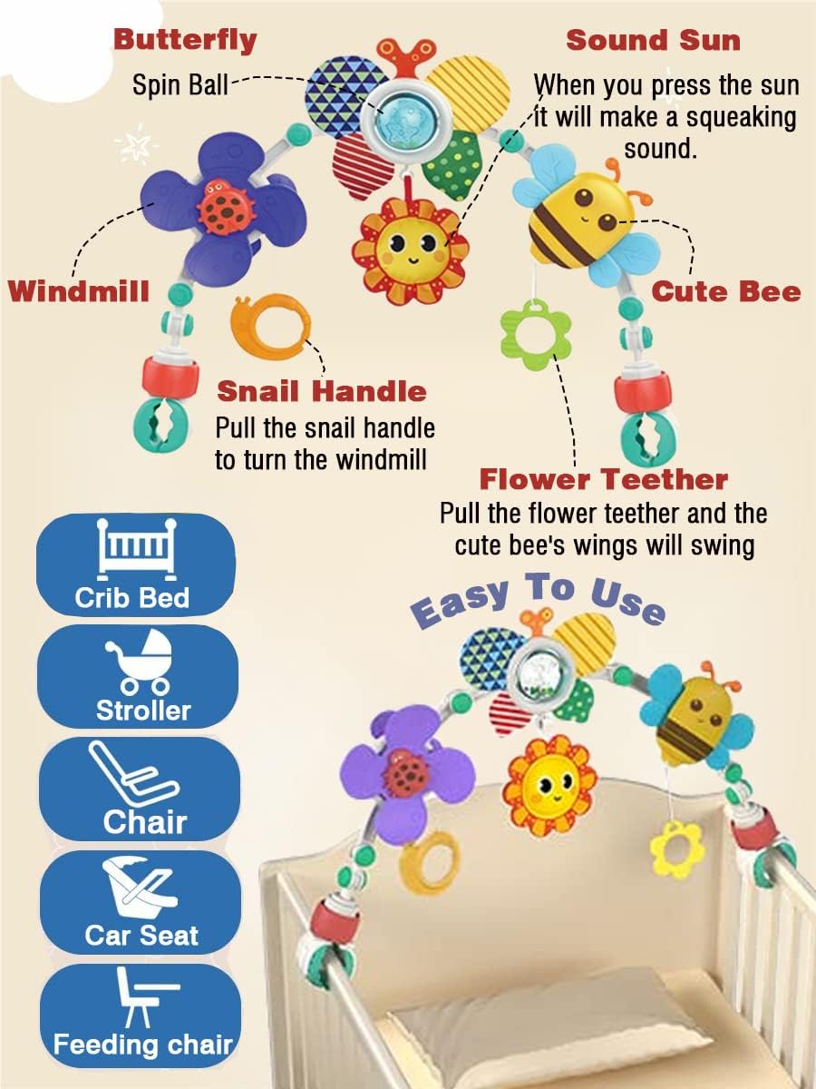 - Carseat toys for infants 0-6 months,Stroller toys have variety of graphics,Ladybug Windmill.Flower teether.Snail.Cute Bee.Bullt-in BB squeaker in the sun,press to make a Bi~ Bi~ sound.Butterfly colorful rotating ball rattle.