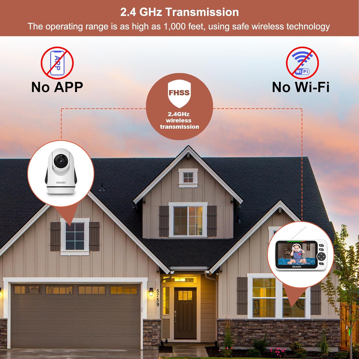 - Secure Baby Monitoring:Experience the Ultimate in Baby Monitoring Security with Our Advanced 2.4GHz FHSS and Digital Encryption Technology. No WiFi, No Apps, Your Privacy Can be Protected. With a Transmission Range of up to 1,000 Feet and Low Latency, You Can Track Your Baby's Every Move from anywhere in Your Home.