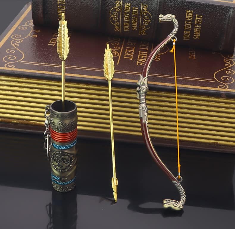 - [Size] 18cm /8''inches Metal design based on Game God of War Ragnarök Atreus Talon Bow and Arrow in Quiver; very fun to play as a fidget toy or set as decorations in rooms.