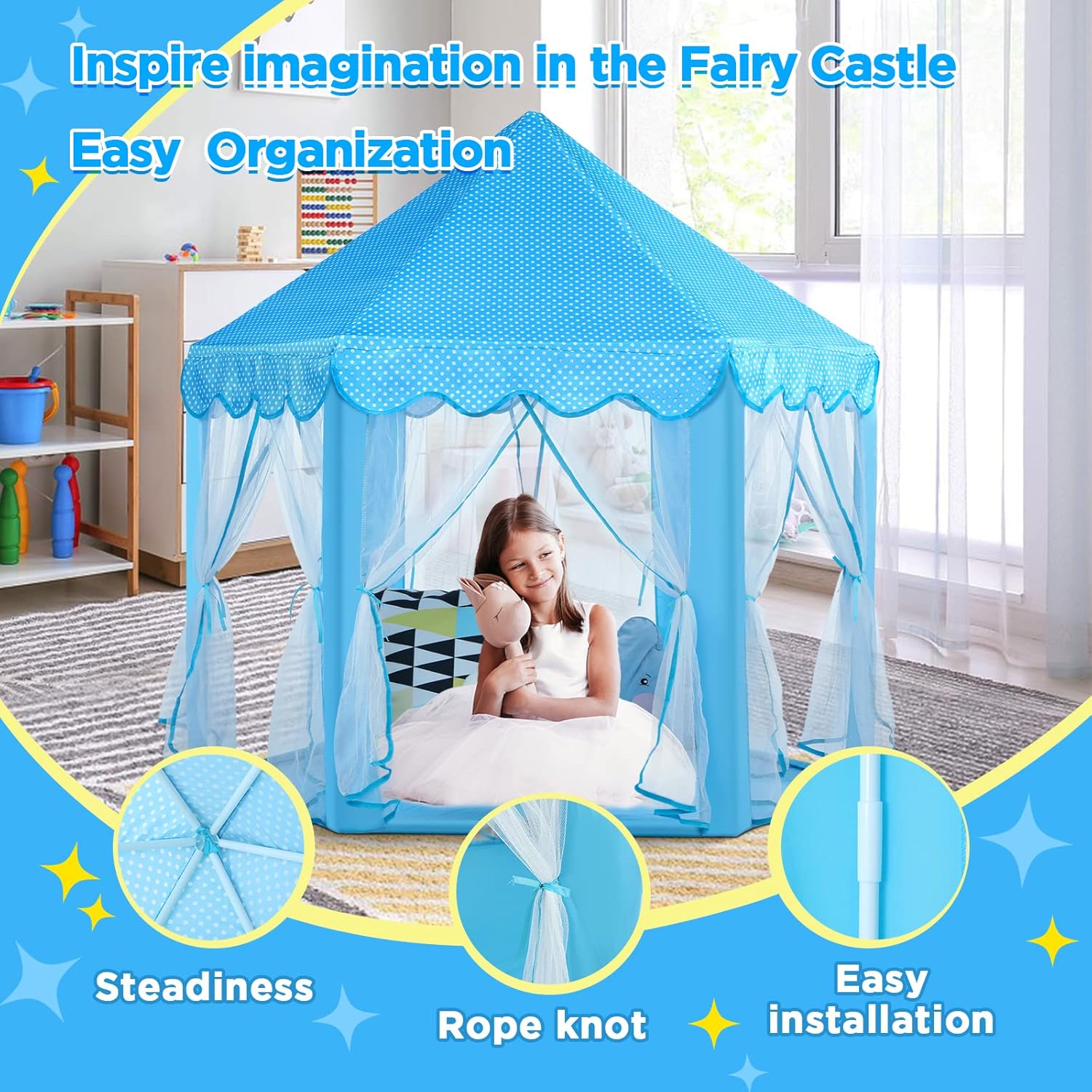 Monobeach Princess Tent Girls Large Playhouse Kids Castle Play Tent with Star Lights Toy for Children Indoor and Outdoor Games, 55'' x 53'' (DxH) (Blue Prinecss Tent with Little Star Lights)