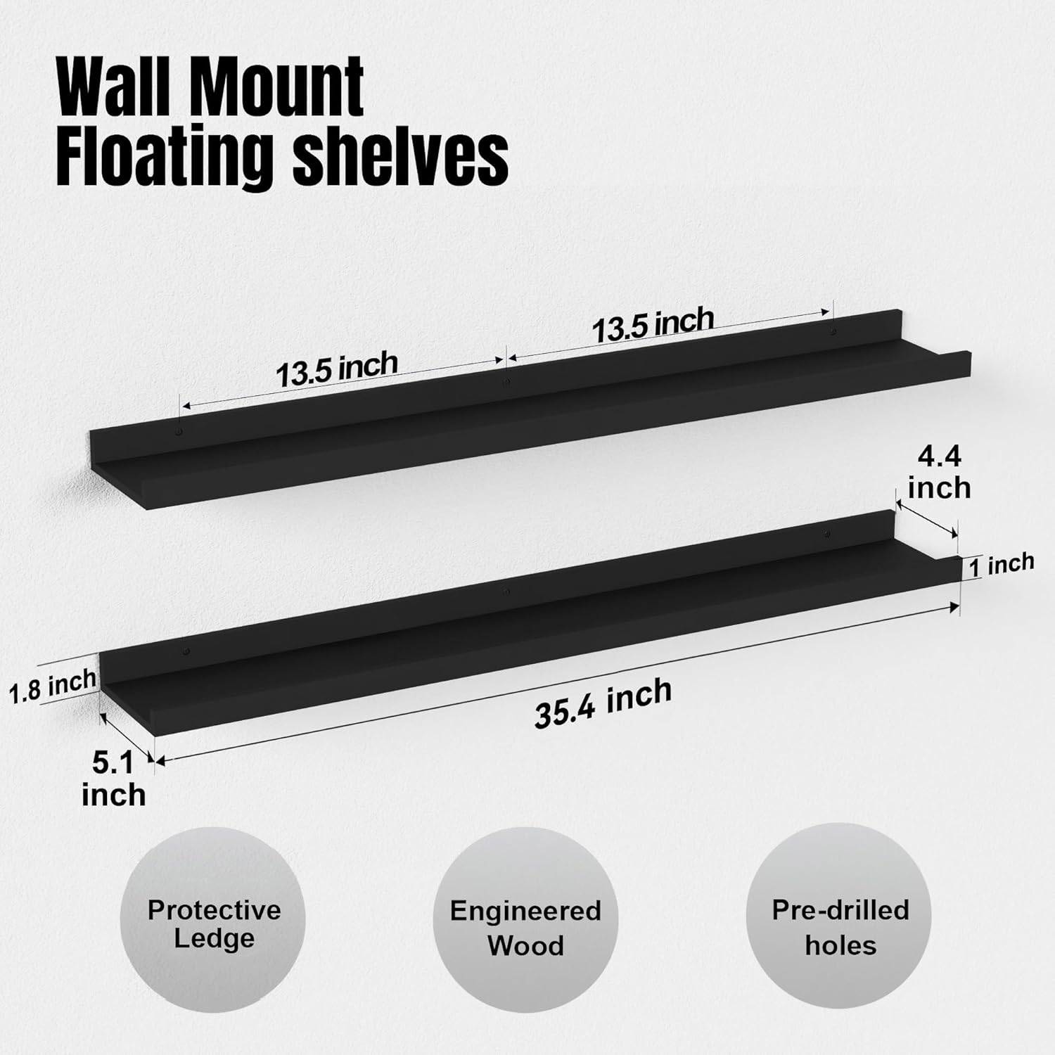 - Sturdy Wall Storage - Crafted from high-quality engineered wood, these shelves are designed to hold up to 20 lbs of art pieces. With dimensions of 5.3"D x 35.4 "W x 1.8"H, these shelves provide practical solutions for wall organization while complementing any decor style, from modern to traditional, rustic to contemporary.