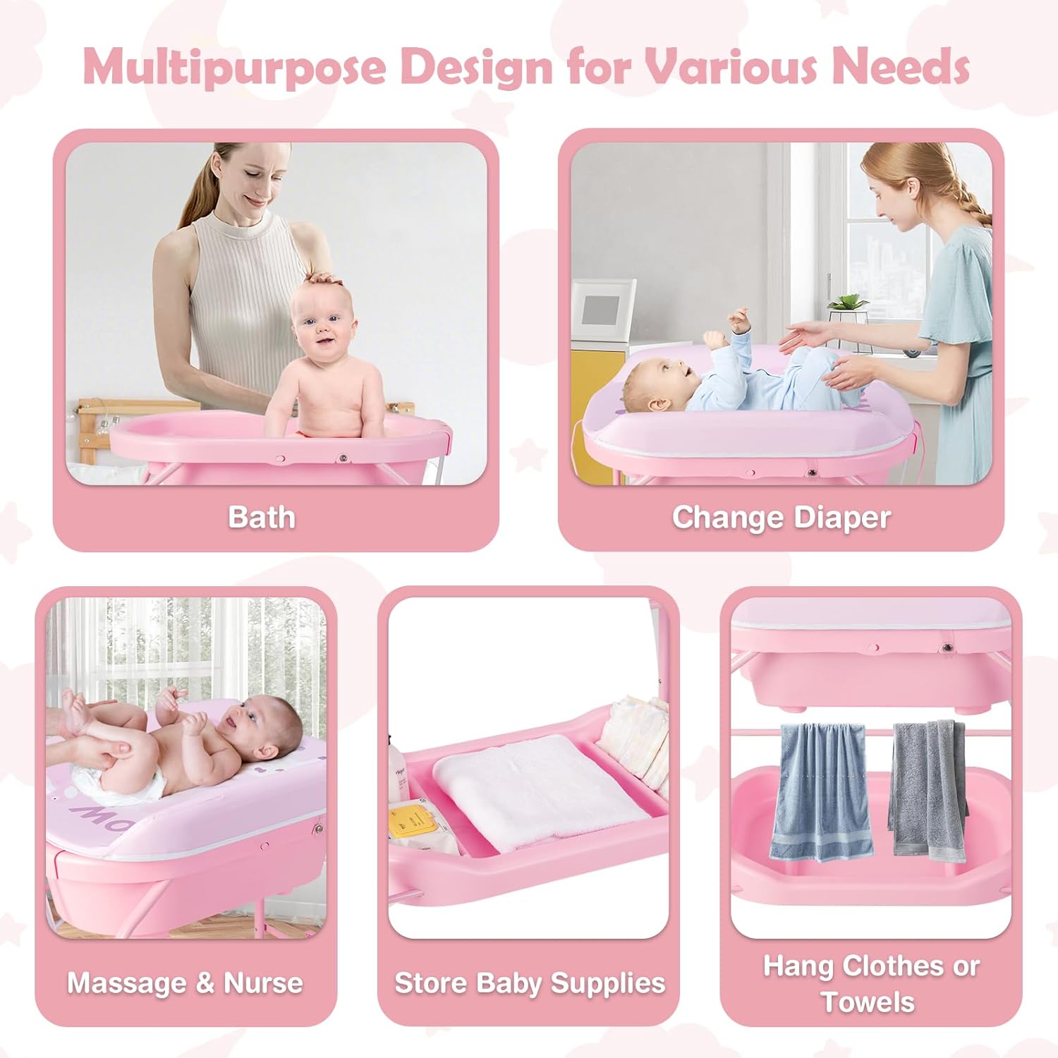 HONEY JOY Baby Changing Table with Bathtub, Foldable Infant Diaper Changing Station with Wheels, Storage Tray, Waterproof Pad, Portable Newborn Nursery Organizer Bath Stand for Boys Girls (Pink)
