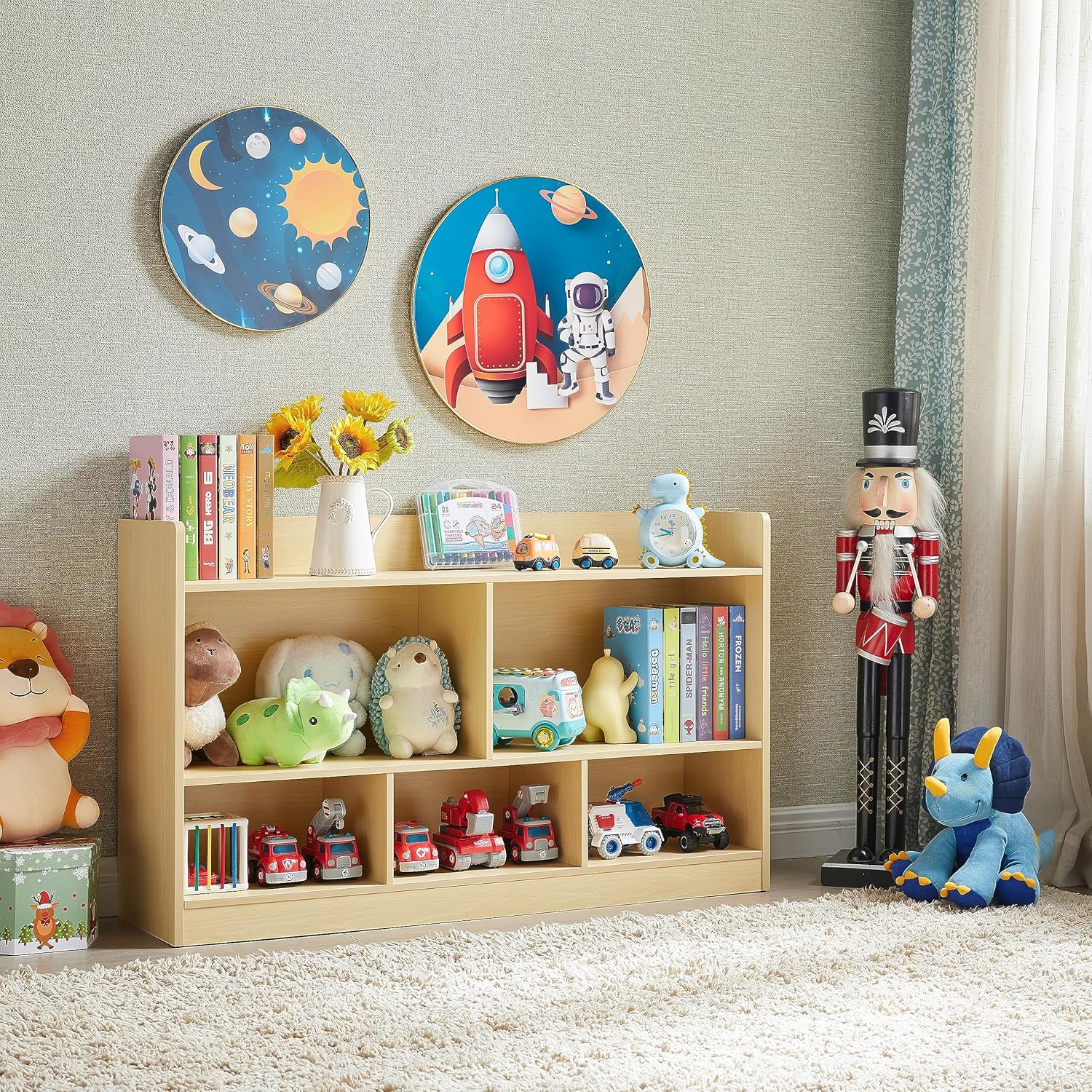 - 【Keep Kids' Room Neat and Tidy with Toy Storage Organizer】- With five spacious compartments, it provides ample storage and display space for books, toys, art supplies, and more. Say goodbye to messy rooms and cluttered floors! Our organizer lets you keep everything in its place. You can even create fun hidden storage spaces with woven boxes, reducing visual clutter and adding a playful touch to your child's room.