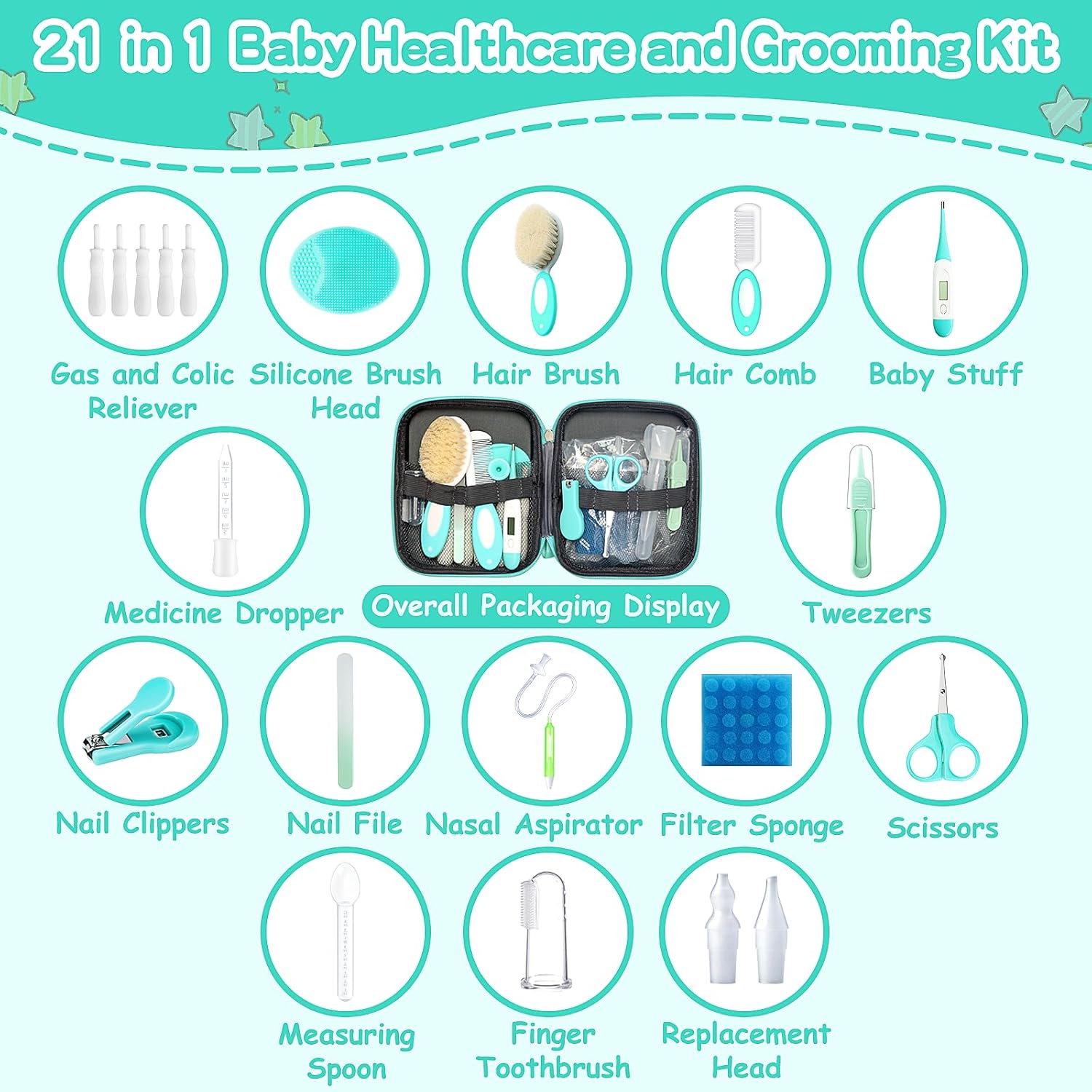 - 21 in 1 Baby Healthcare And Grooming Kit: The package comes with scissors, finger toothbrush, hairbrush, hair comb, medicine dropper, nasal aspirator (included 2 replacement heads), nail files, nail clipper, liquid medicine spoon, silicone brush head, tweezers, 5pcs gas and colic relievers, hygiene sponge set, and storage case, specially designed for baby newborn baby's daily needs.