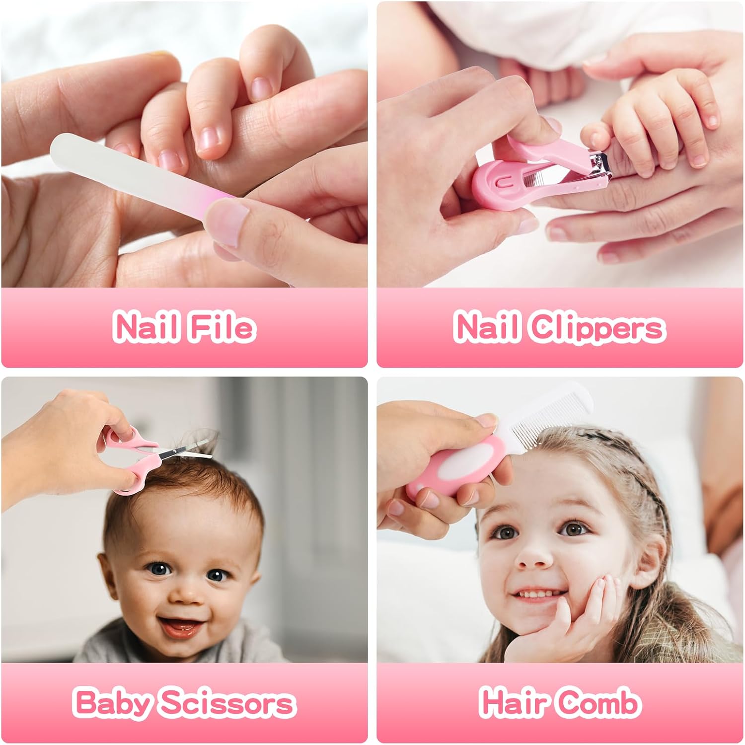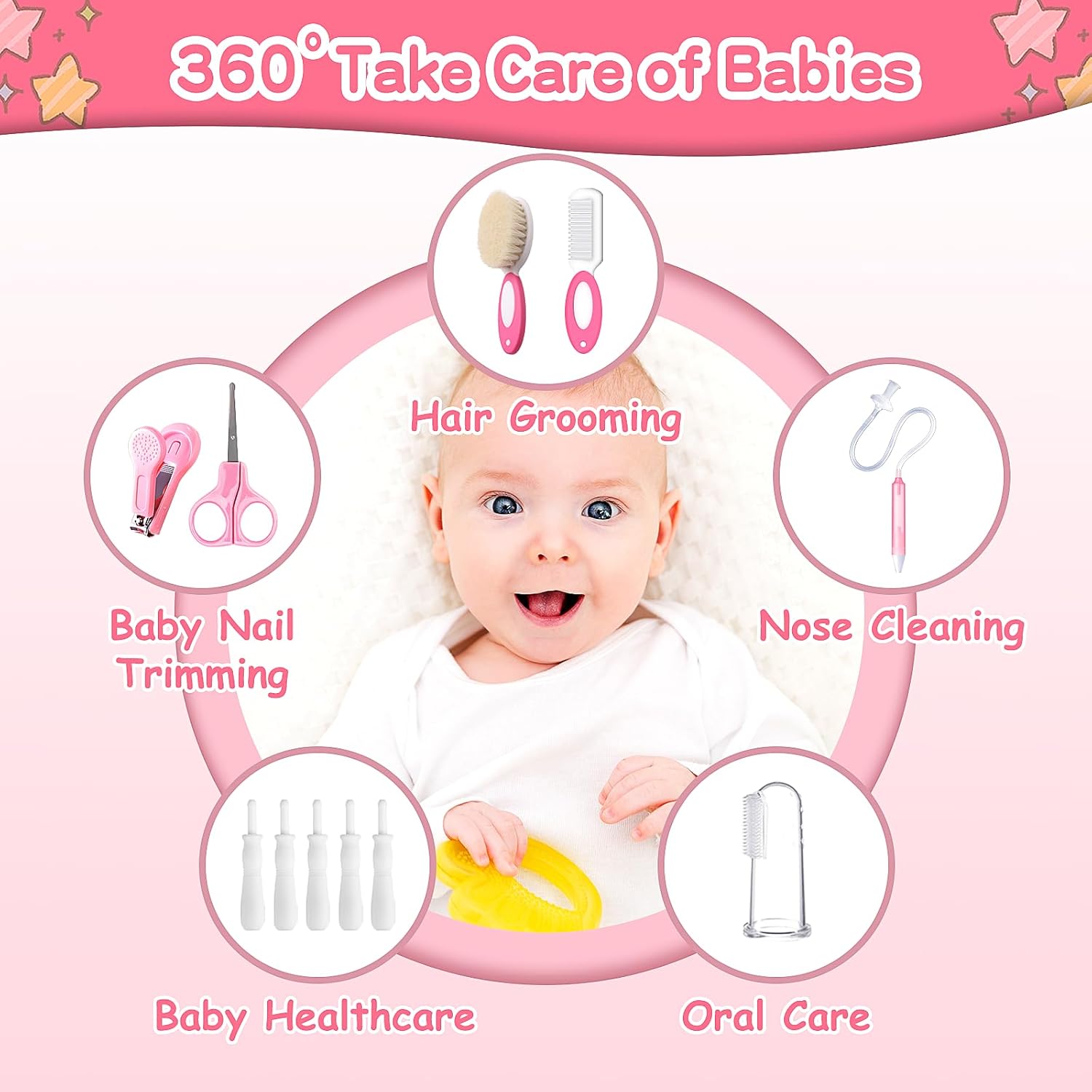 Baby Healthcare and Grooming Kit, 21 in 1 Portable Baby Essentials Kit with Gas Relief Hair Brush Comb Nasal Aspirator for Newborn Boys Girls (Pink)