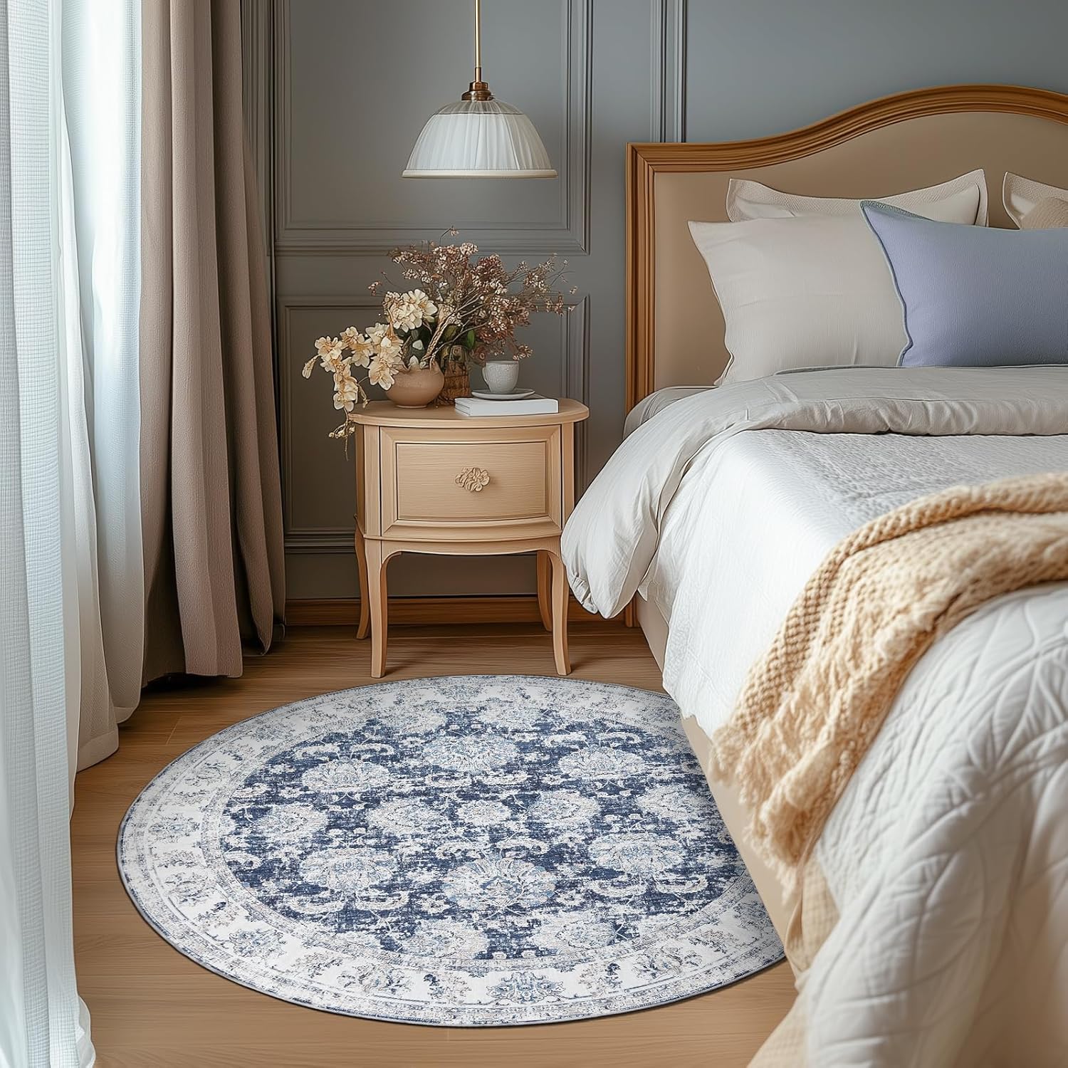 jinchan Round Rug 4ft Area Rugs Vintage Floral Distressed Design - Machine Washable Non-Slip Low-Pile Ultra-Thin Circle Rug for Entryway Bedside Living Room Dining Room Bedroom (4' Round,Dark Blue)