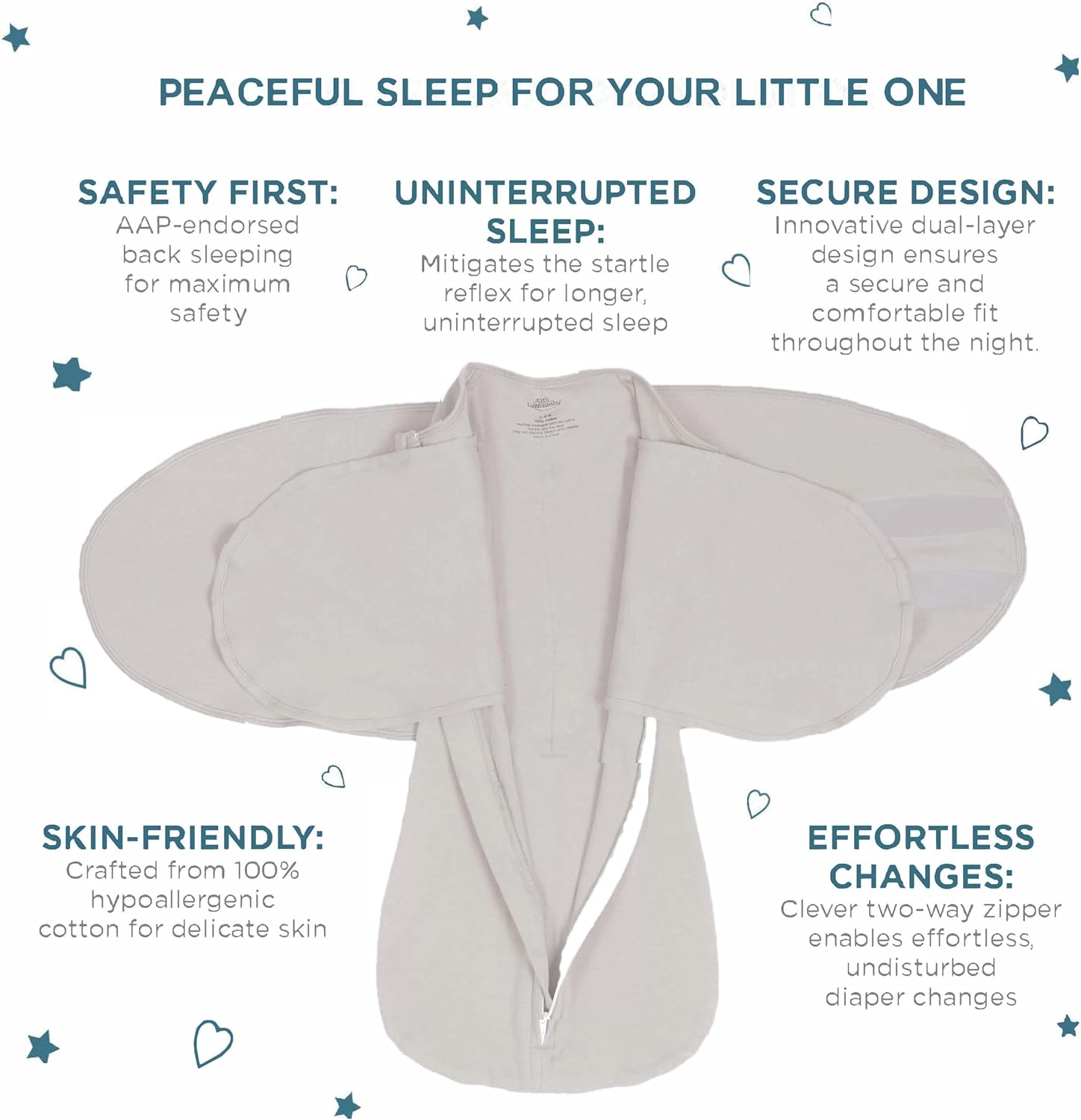 - Safety First: Our swaddle promotes safe sleep, aligning with AAP recommendations by keeping your baby snug on its back.