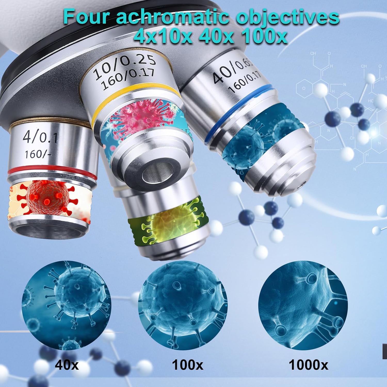 - Laboratory professional microscope: 195 flat-field achromatic objective lens can magnify up to 40X, 100X, 250X, 400X, 1000X and 5000X, high light transmission, better imaging effect of the microscope, clear and sharp, highly color reproduction