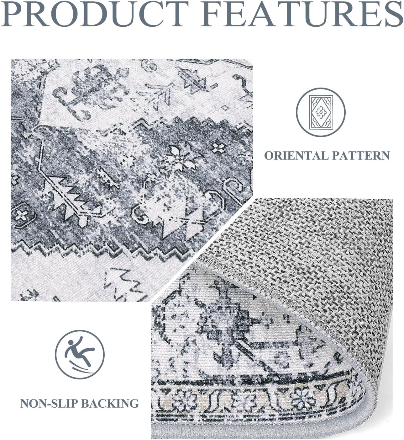 Lahome Boho Round Rugs - 6ft Washable Round Area Rugs for Living Room Grey Non-Slip Throw Dining Room Rug Large Circle Bedroom Rug, Oriental Distressed Print Indoor Rug Round for Entryway Office