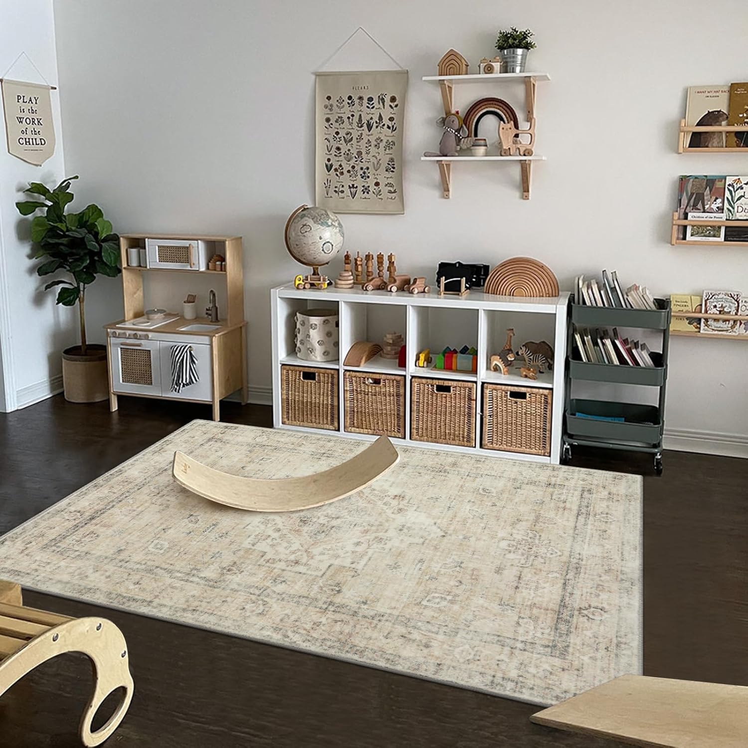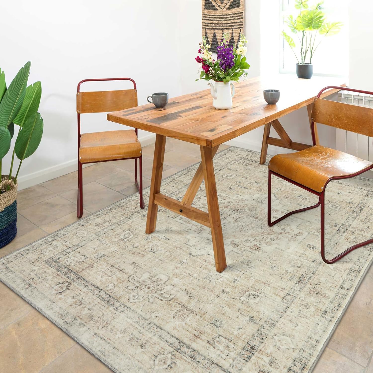 LIVEBOX Bedroom 4x6 Washable Area Rug for Entryway Kitchen, Non-Slip Soft Boho Rugs for Dining Room Office, Farmhouse Low-Pile Neutral Soft Carpet for Nursery Room Playroom, Tan