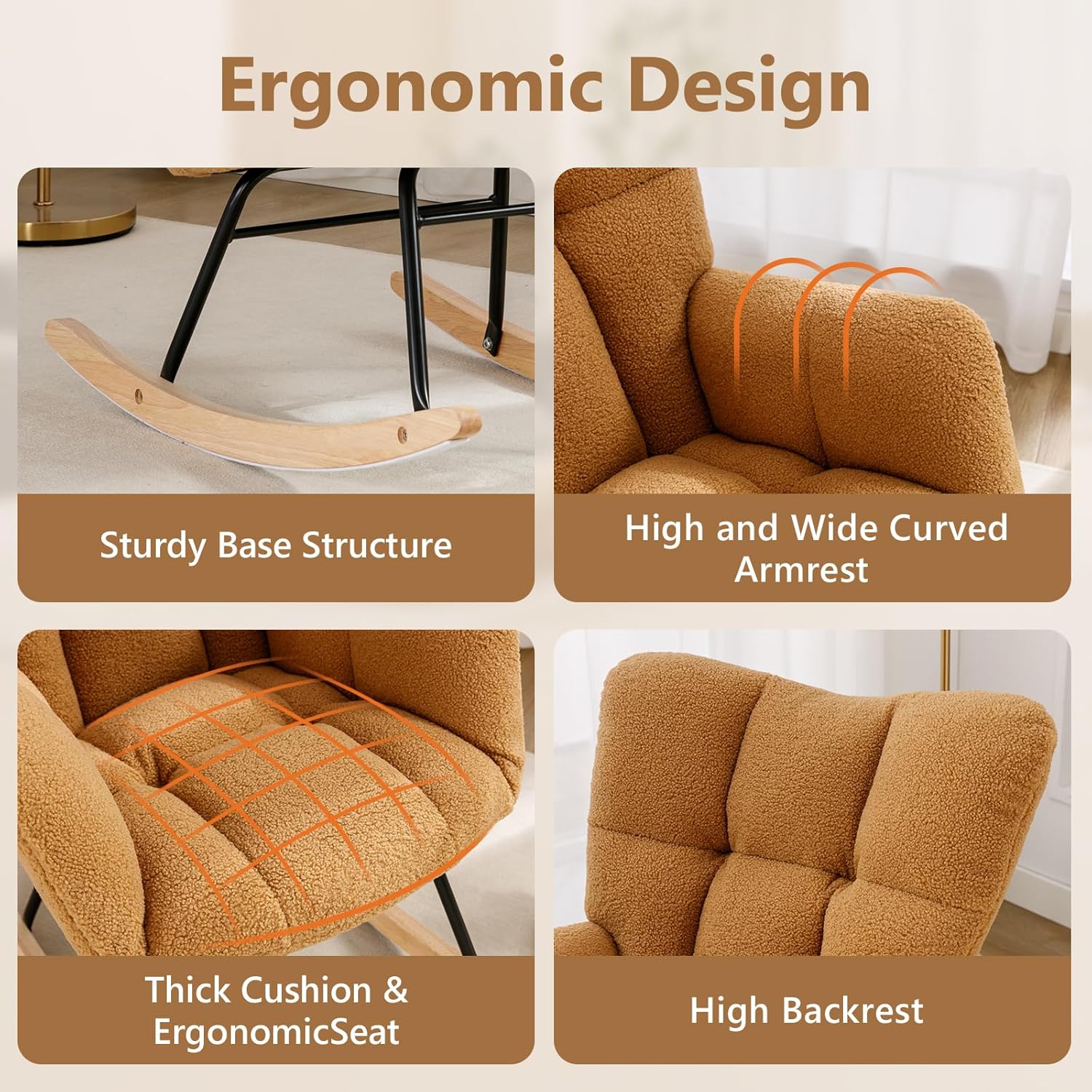 NIOIIKIT Nursery Rocking Chair Teddy Upholstered Glider Rocker Rocking Accent Chair Padded Seat with High Backrest Armchair Comfy Side Chair for Living Room Bedroom Offices (Kahaki Teddy)