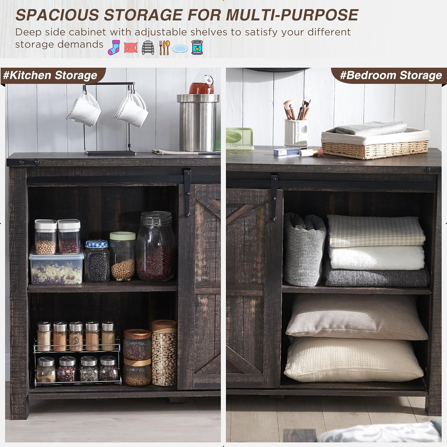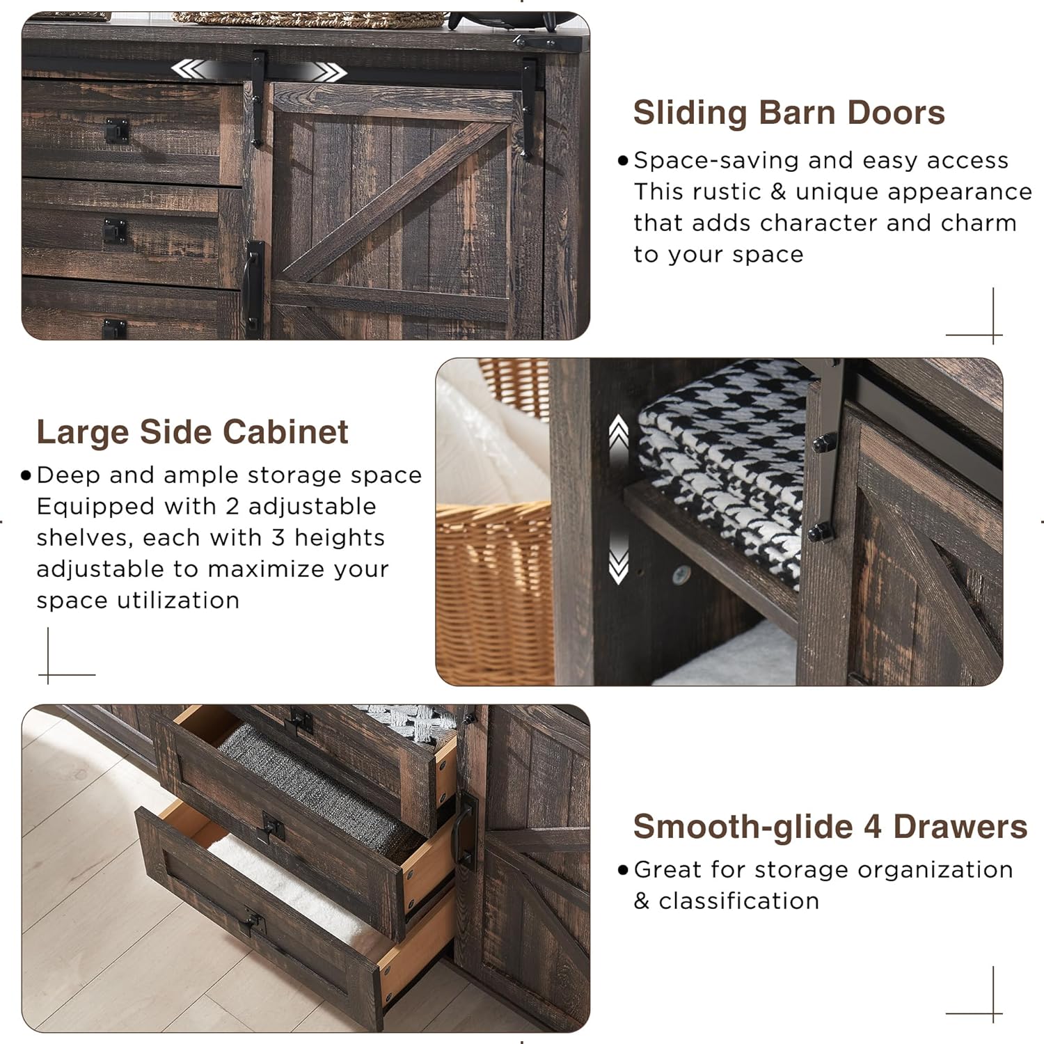 - SLIDING BARN DOORS: The farmhouse space-saving barn door slides open on a metal track to reveal adjustable shelf space, allowing you to hide or show storage spaces freely. The shelf with 3 height adjustable and is also removable enabling flexible storage of different-sized items. The smooth-glide track makes it convenient for people of all ages and abilities to open and close with minimal effort. This wide dresser can be particularly beneficial to maintain a clutter-free and organized look.