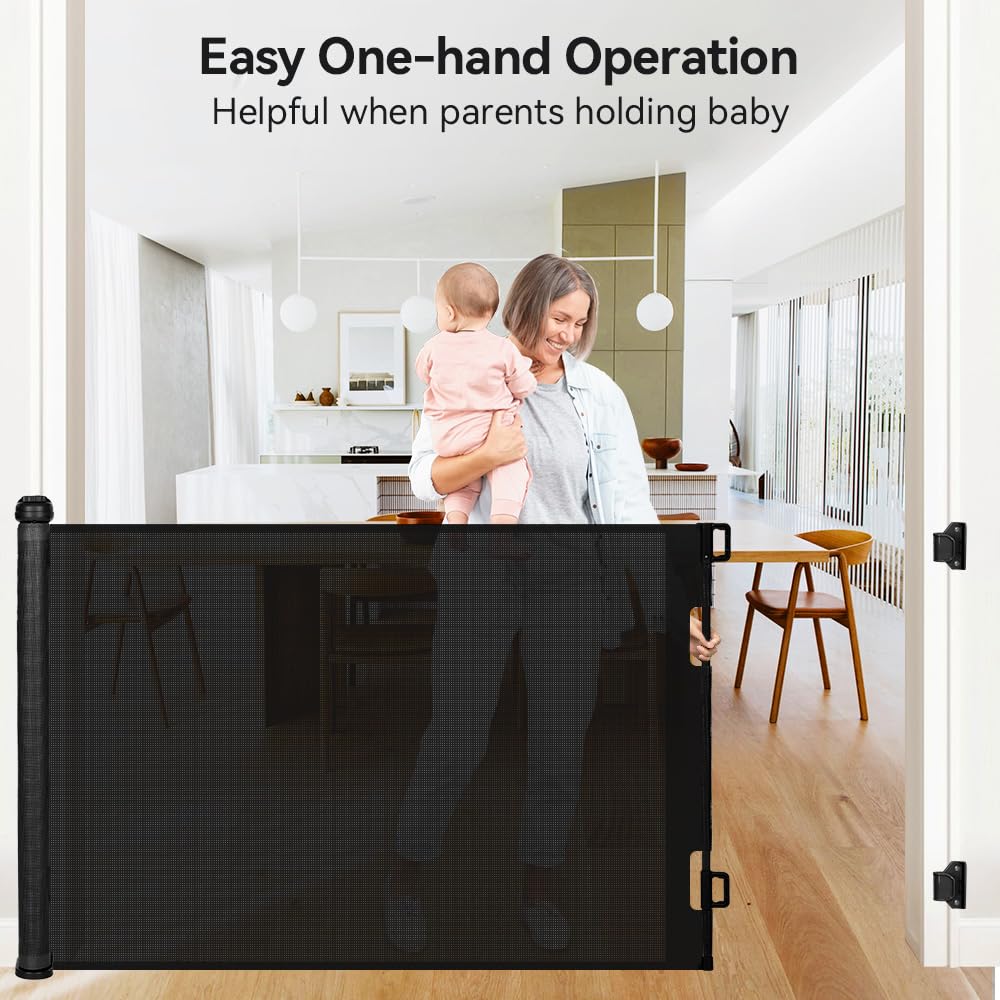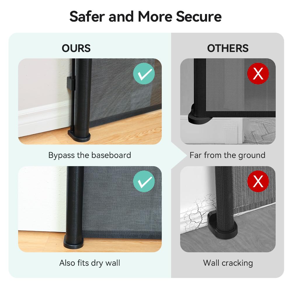 - Secure&Sturdy Baby Gate: No need to worry about sneaky escapes with this safety gate! Its improved design includes 3 floor hooks for solid anchoring. Plus, a rotating knob tightens the mesh door net, preventing sagging and effectively confining young children or pets. Made from high-quality, sturdy mesh, the baby gates extra wide resists warping and wrinkling
