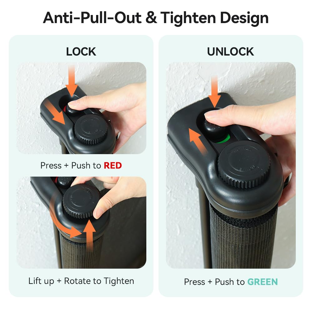 - Lockable Safety Design: The retractable pet gate features a lockable design at the top for added security. A press and slide switch locks or unlocks the extra long pet gates, with red and green indicators for clear understanding. The hidden lock keeps the child gate secure from inquisitive hands. NOTICE: When the indicators shows red, it can only be locked and not stretched outward