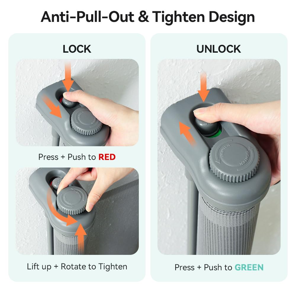 - Lockable Safety Design: The retractable pet gate features a lockable design at the top for added security. A press and slide switch locks or unlocks the extra long pet gates, with red and green indicators for clear understanding. The hidden lock keeps the child gate secure from inquisitive hands. NOTICE: When the indicators shows red, it can only be locked and not stretched outward
