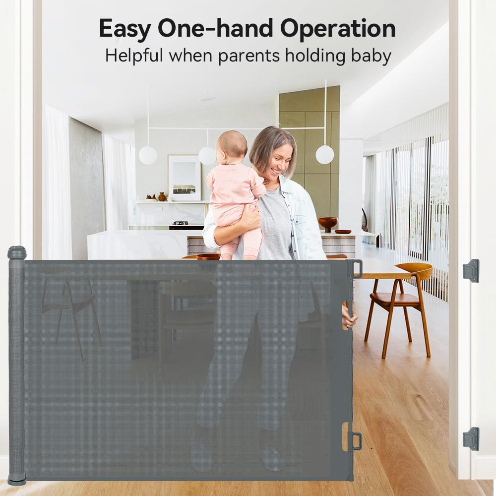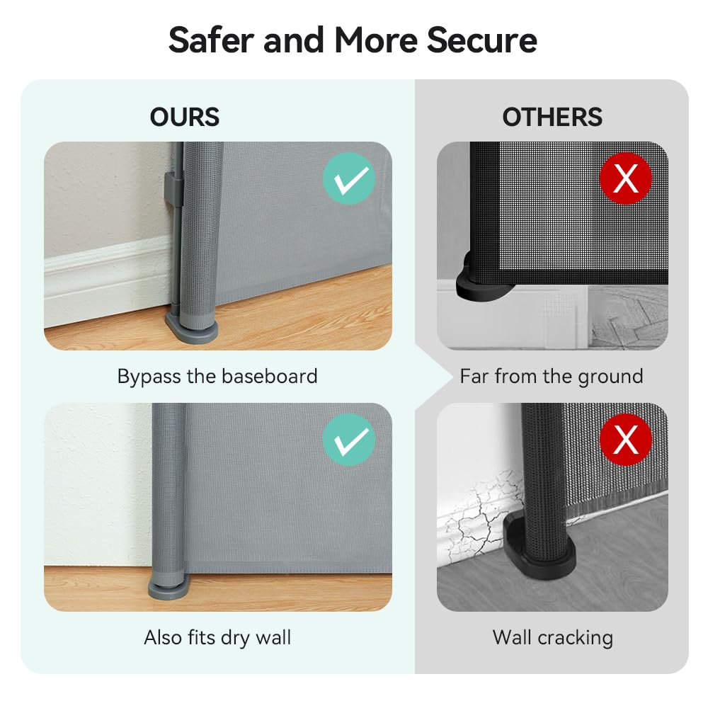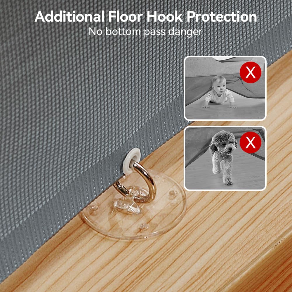- Secure&Sturdy Baby Gate: No need to worry about sneaky escapes with this safety gate! Its improved design includes 3 floor hooks for solid anchoring. Plus, a rotating knob tightens the mesh door net, preventing sagging and effectively confining young children or pets. Made from high-quality, sturdy mesh, the baby gates extra wide resists warping and wrinkling