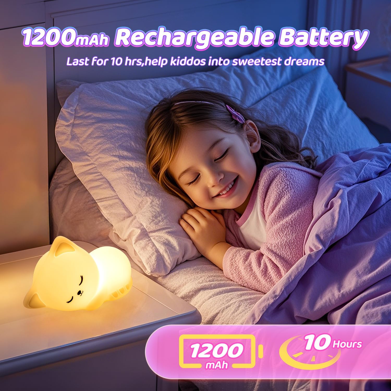 - ๐Upgraded Dimmable & Easy Remote Control: Cute cat kids night lights for bedroom is dimmable, night light for kids cute lamps allow u to freely adjust the brightness by REMOTE. Cute cat night light for kids allows new moms to choose soft light for breastfeeding, diaper changes or trips to the bathroom without wakes up baby.Cute cat night lights for kids room soothe baby emotions, keep nightmares away & guard yr kids every night.U can easily remote the cat night light for kids on the bed