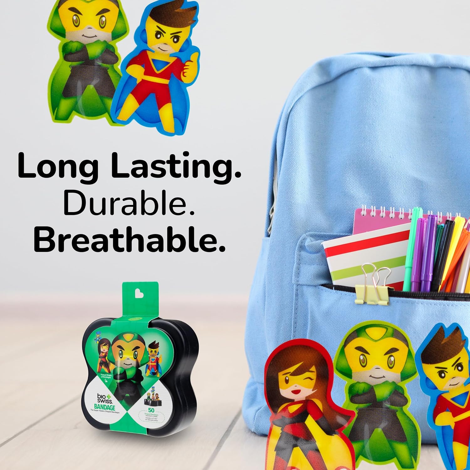 BioSwiss Bandages, Super Healers Superhero Shaped Self Adhesive Bandage, Latex Free Sterile Wound Care, Fun First Aid Kit Supplies for Kids and Adults, 50 Count