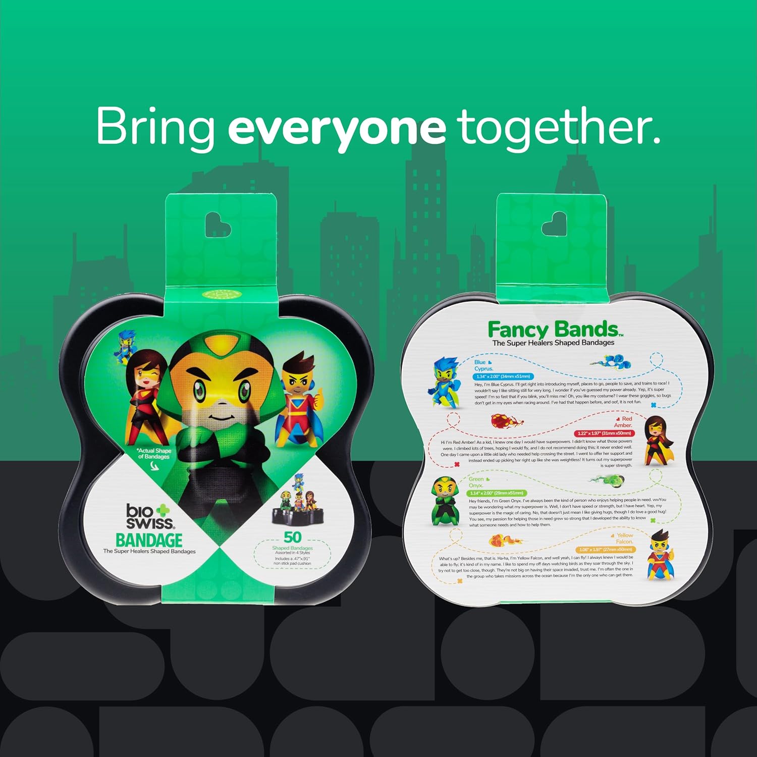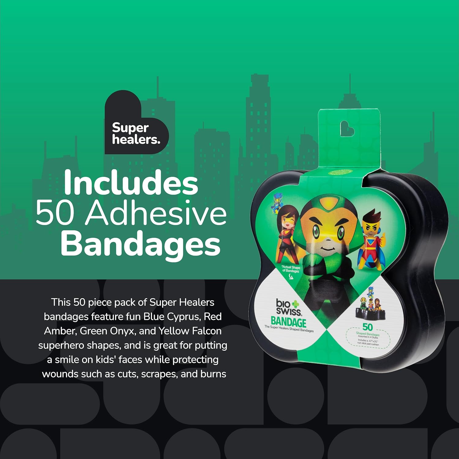 - SUPERHEROES BANDAGES: This 50 piece pack of Super Healers bandages feature fun Blue Cyprus, Red Amber, Green Onyx, and Yellow Falcon superhero shapes, and is great for putting a smile on kids' faces while protecting wounds such as cuts, scrapes, and burns; sticky bandages come in a cute plastic container and are perfect for kids and adults alike, and also for school nurses and pediatric doctors