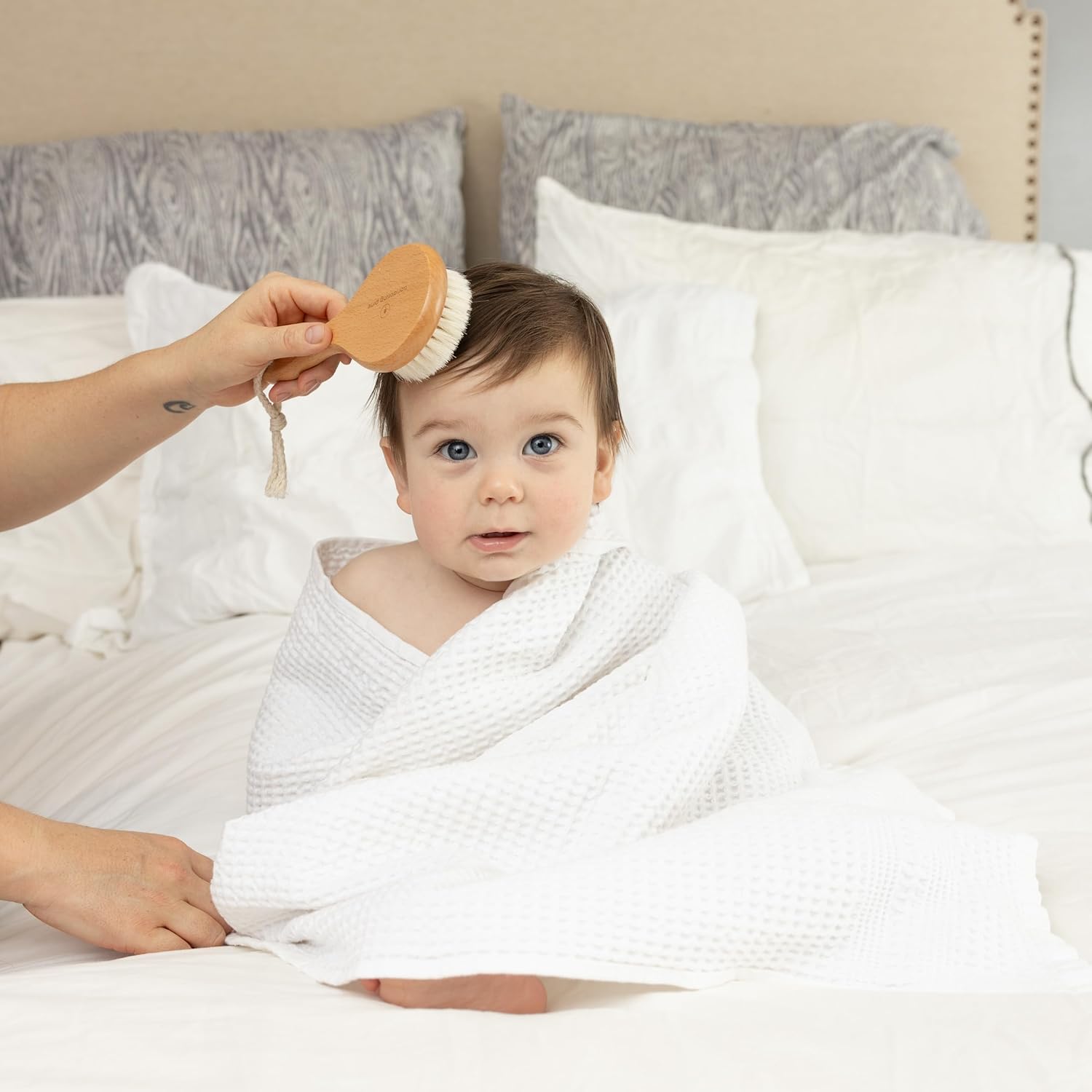 - Healthy Scalp & Cradle Cap Brush – Gently massage your baby's scalp with our naturally soft bristle goat hair brush to stimulate blood flow and evenly distribute natural oils, helping prevent cradle cap while keeping your baby’s scalp healthy and nourished. Every brush stroke creates a calming, luxurious bonding moment that promotes a healthy glow.
