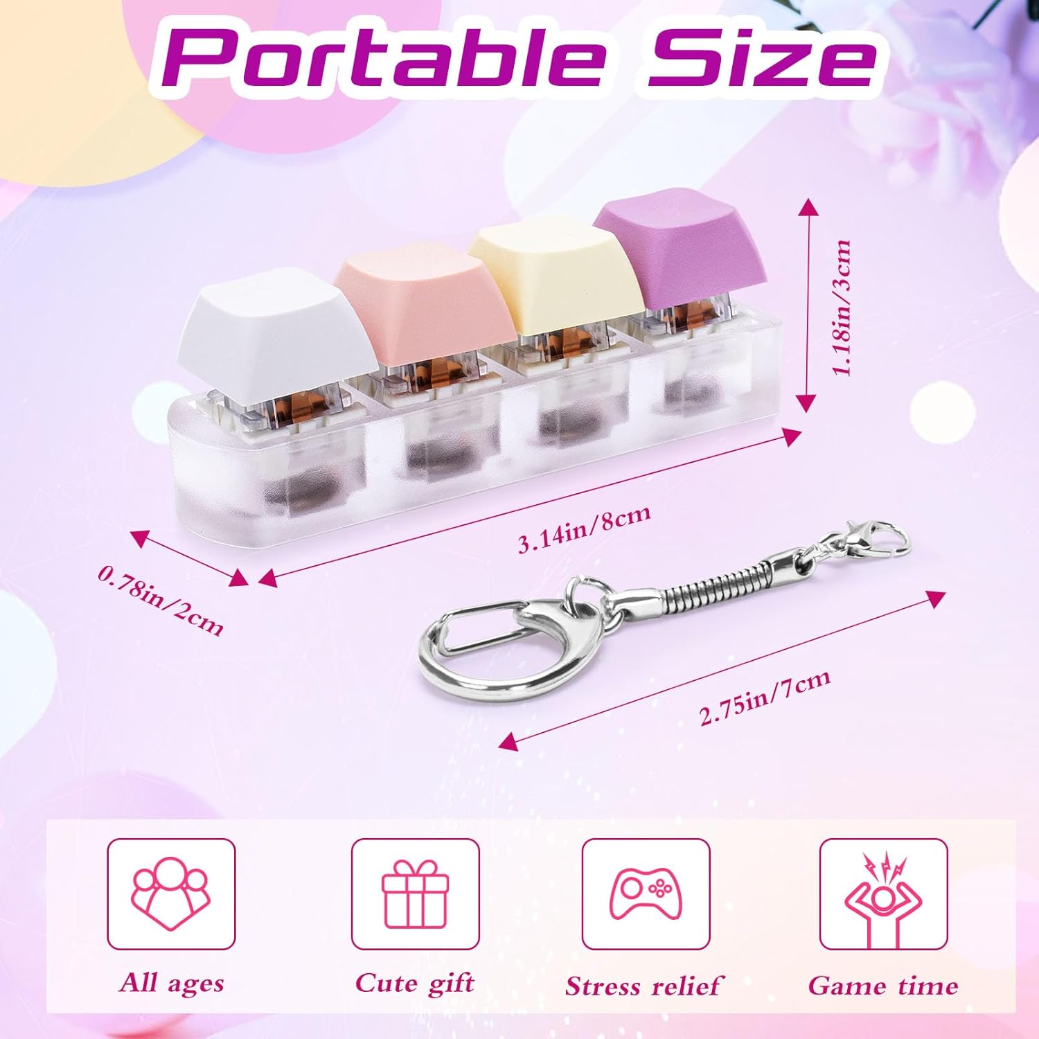 - Keyboard Fidget Toys: The fidget keyboard toy consists of four keycaps, four internal cores with LED light and a transparent frosted base, and is a 4-in-1 keyboard fidget with a keychain. The color of the 4-in-1 mechanical keycap fidget is Macaron in white, pink, yellow and purple and it is a cute and creative fidget toy. Click on the button of your small fidget toy and it will sparkle with colorful LED lights
