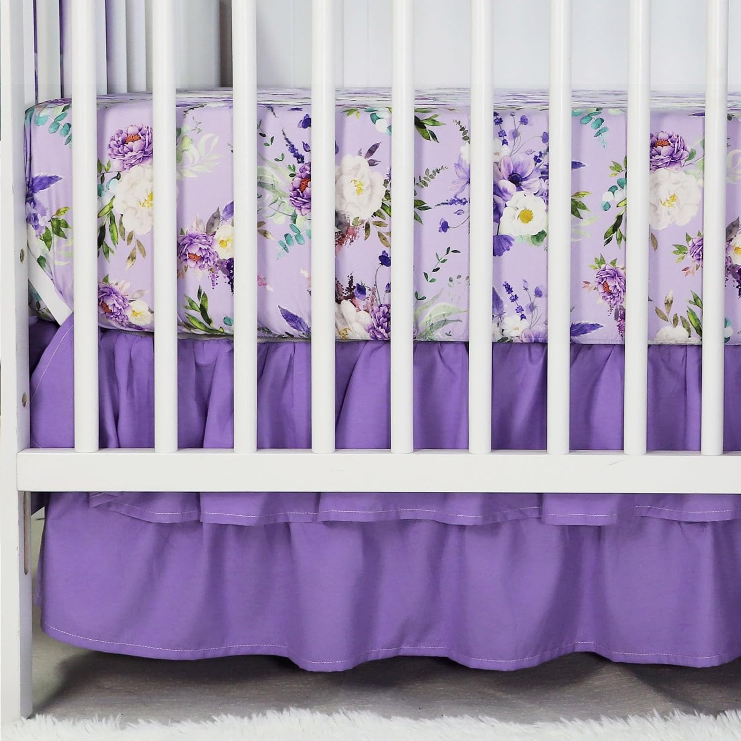 Crib Bedding Set for Girls, Purple Baby Crib Bedding Set 4 Piece, Baby Girl Nursery Bedding Set Including Comforter, Fitted Crib Sheet, Crib Skirt, Diaper Stacker, Floral
