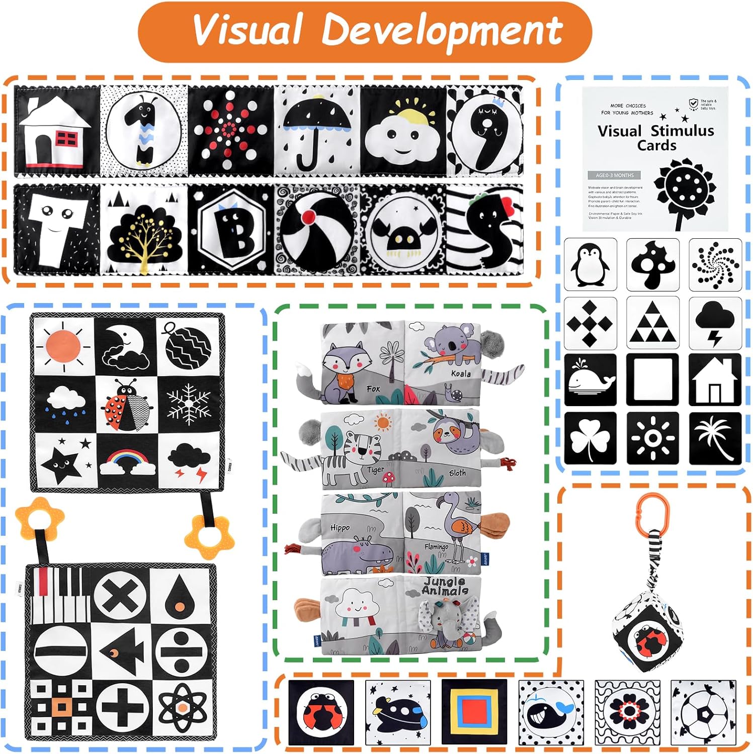 - High Contrast Baby Toys 0-6 Months - Our baby books and toys are specially designed for newborns with high contrast colors and patterns that are great for tummy time and sensory development. They help stimulate your baby's visual perception and attention.