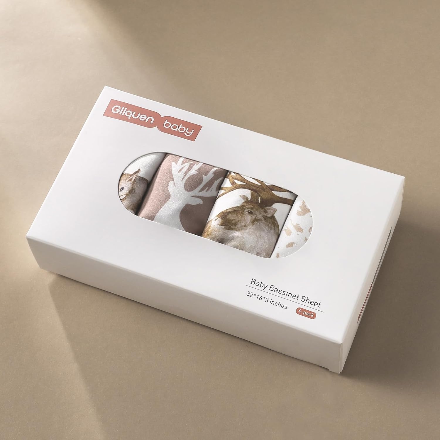 Gllquen Baby Bassinet Sheets 4 Pack, Breathable Cozy Fitted Mattress Sheet, Elastic Travel Crib Fashionable Floral Pattern, Standard Cradle Safe Sheets for Baby Boys Girls 32"x16" (Christmas elk)