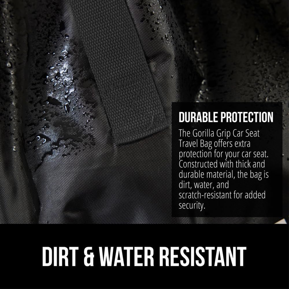 - DURABLE PROTECTION FOR YOUR CAR SEAT: a must for traveling, the Gorilla Grip Car Seat Travel Bag is designed to help protect your car seat while you travel; bag is water, tear and dirt resistant; features drawstring closure that tightly closes around the car seat, helping to protect from dirt, grime and moisture; bag is made of lightweight, yet durable material that can be machine washed