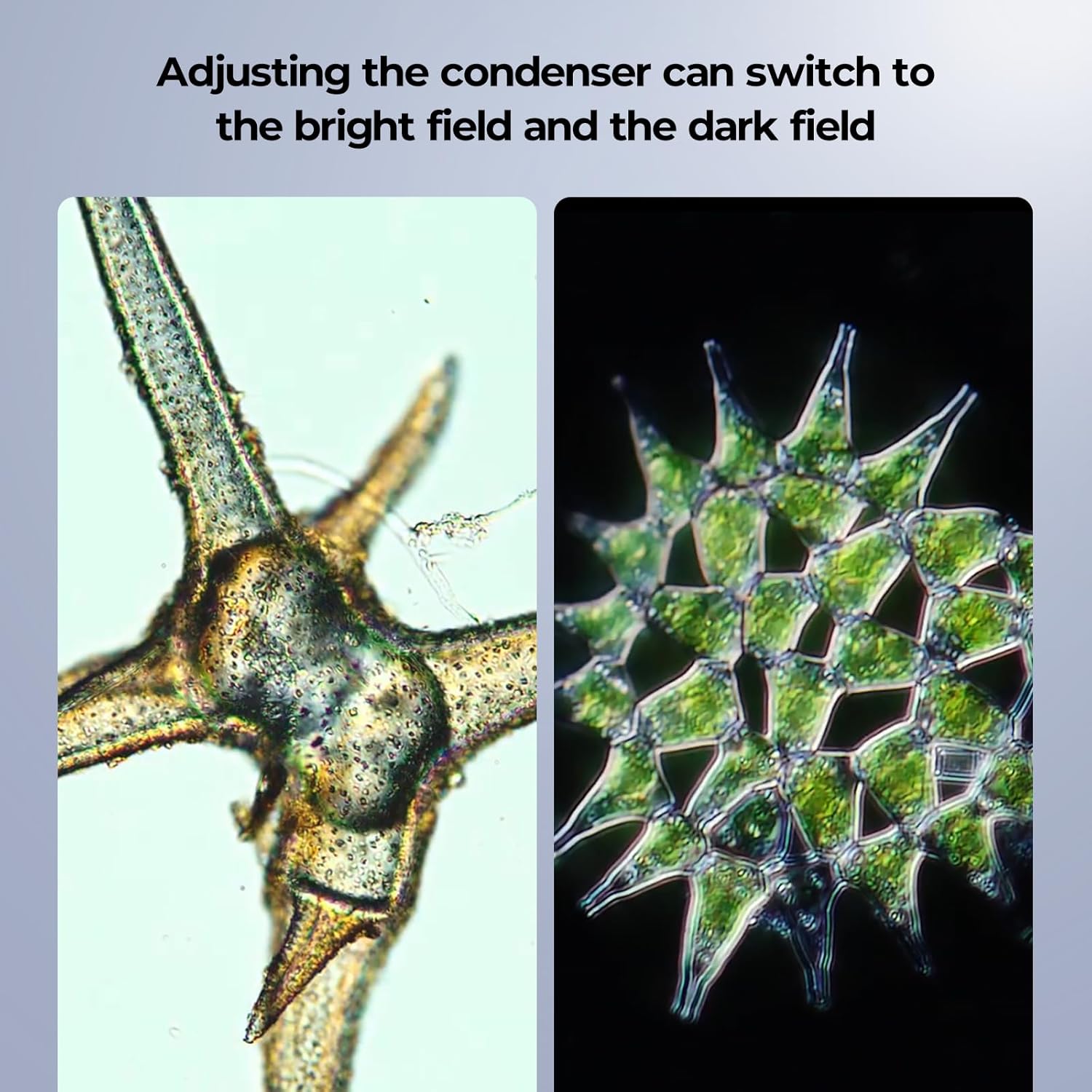 - [Brightfield & Darkfield]: NA 1.25 Abbe condenser with iris diaphragm, Support brightfield and darkfield.【Noticed: Because different types of dark fields have high requirements for light, this dark field microscope is for researching live blood】