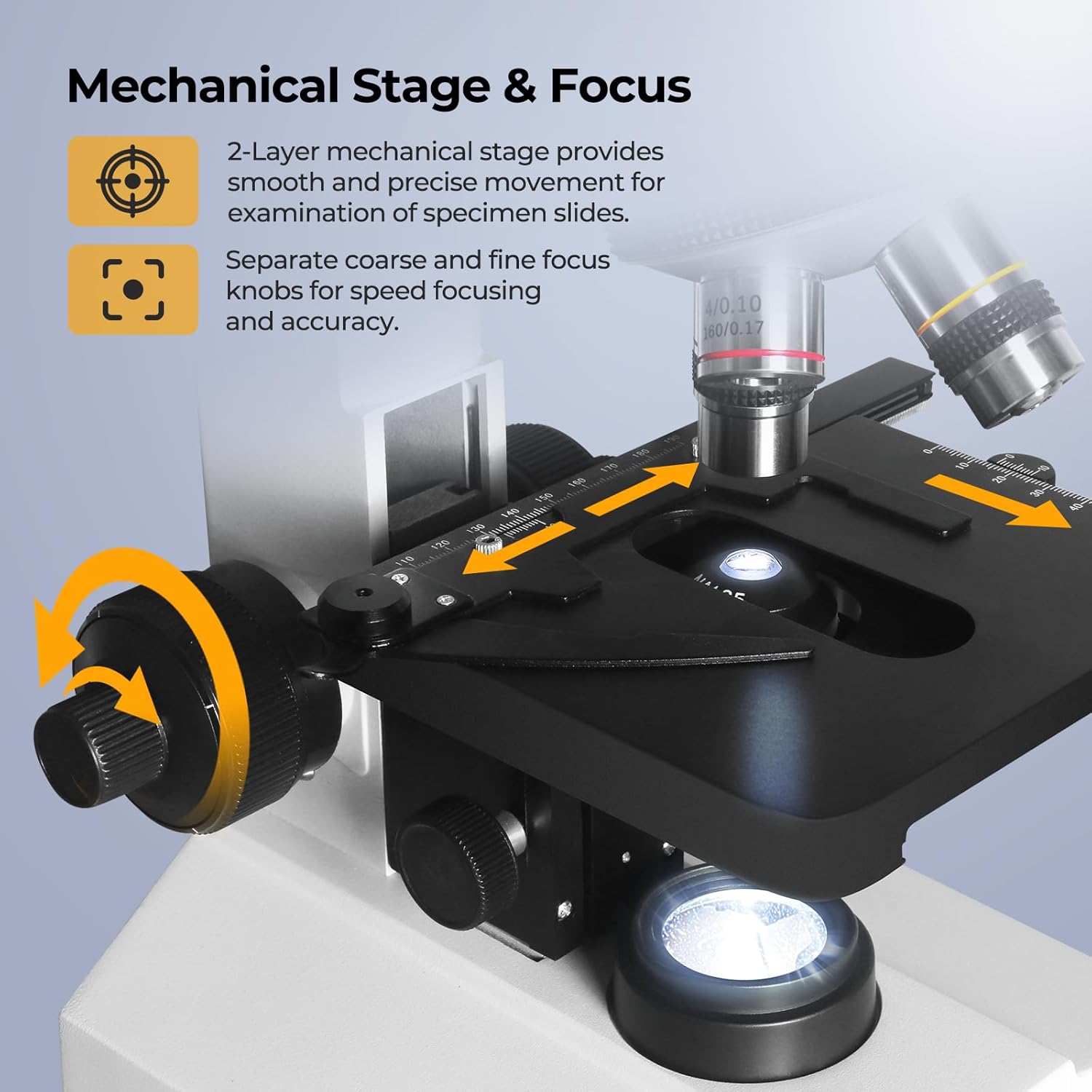 - [Double-layer mechanical stage & LED light]: With 1.0mm stage divisions, locks slide into place and provides precise slide manipulation along the X- and Y-axis to allow coordinates to be recorded, enabling the viewer to return to a specific location on the slide. LED illumination, and 1.25 NA Abbe condenser with iris diaphragm for clear examination and light control