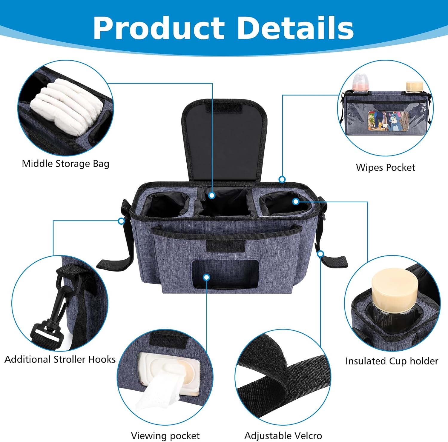 - Multiple Usage Methods : It can be hung as a stroller cup holder organizer on the stroller. When you don't need to use a stroller, you can also install the accompanying strap and carry this organizer bag for easy outing.