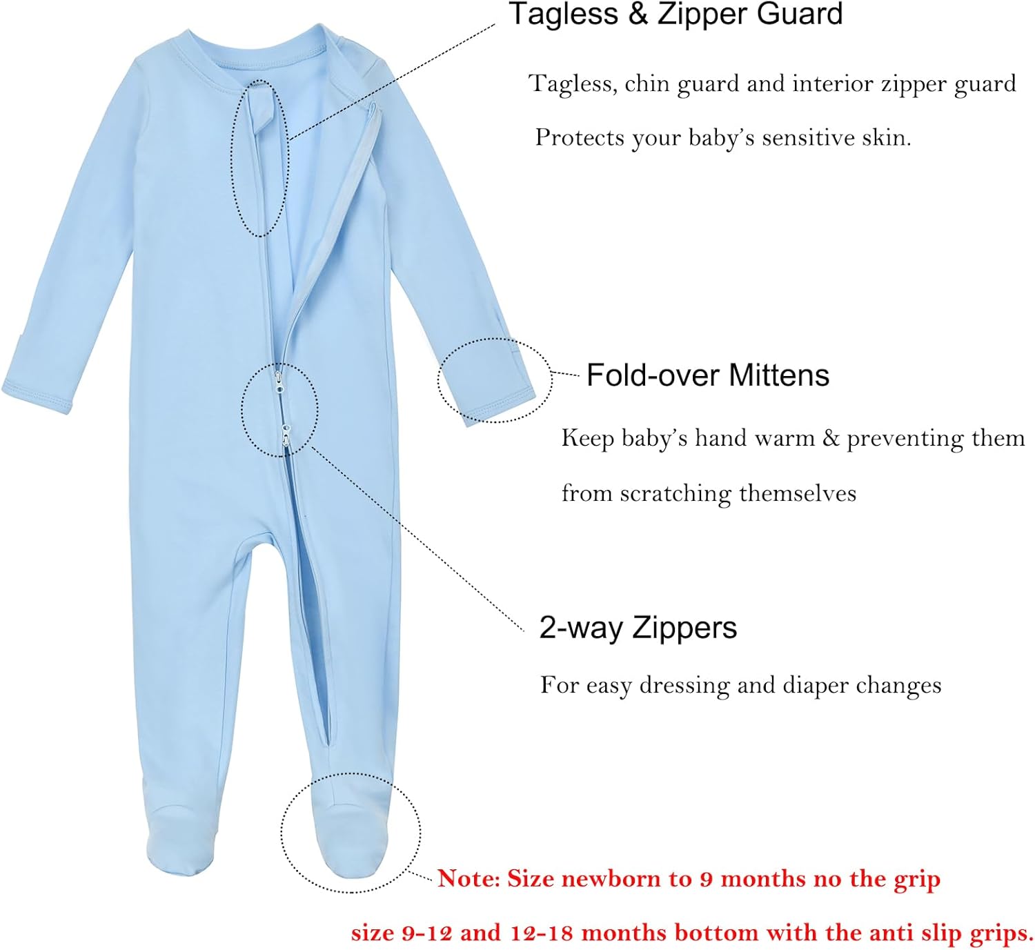 - 【Built-in Mittens and Footed】All sizes design with reversible mitten hand covers to prevent baby from scratching themselves. This 9-12 months baby footie pjs features grip on the feet for extra stability. Great for little baby on the move(size 0-9 months and snap style all size without non-slip grips)