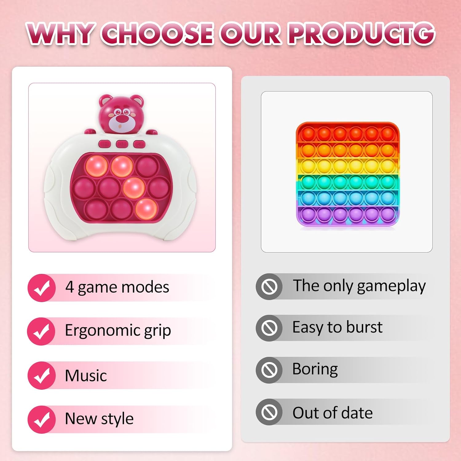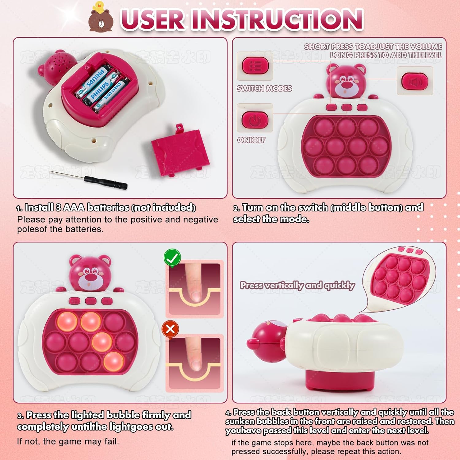 - ๐ ใVersatile Pop Fidget Game MachineใGet ready for endless hours of fun with our versatile pop fidget toy! With four exciting game modes, including single-player challenges and multiplayer showdowns, this handheld toy is perfect for players of all ages. Simply install three AAA batteries and adjust the volume to your liking, then let the games begin!