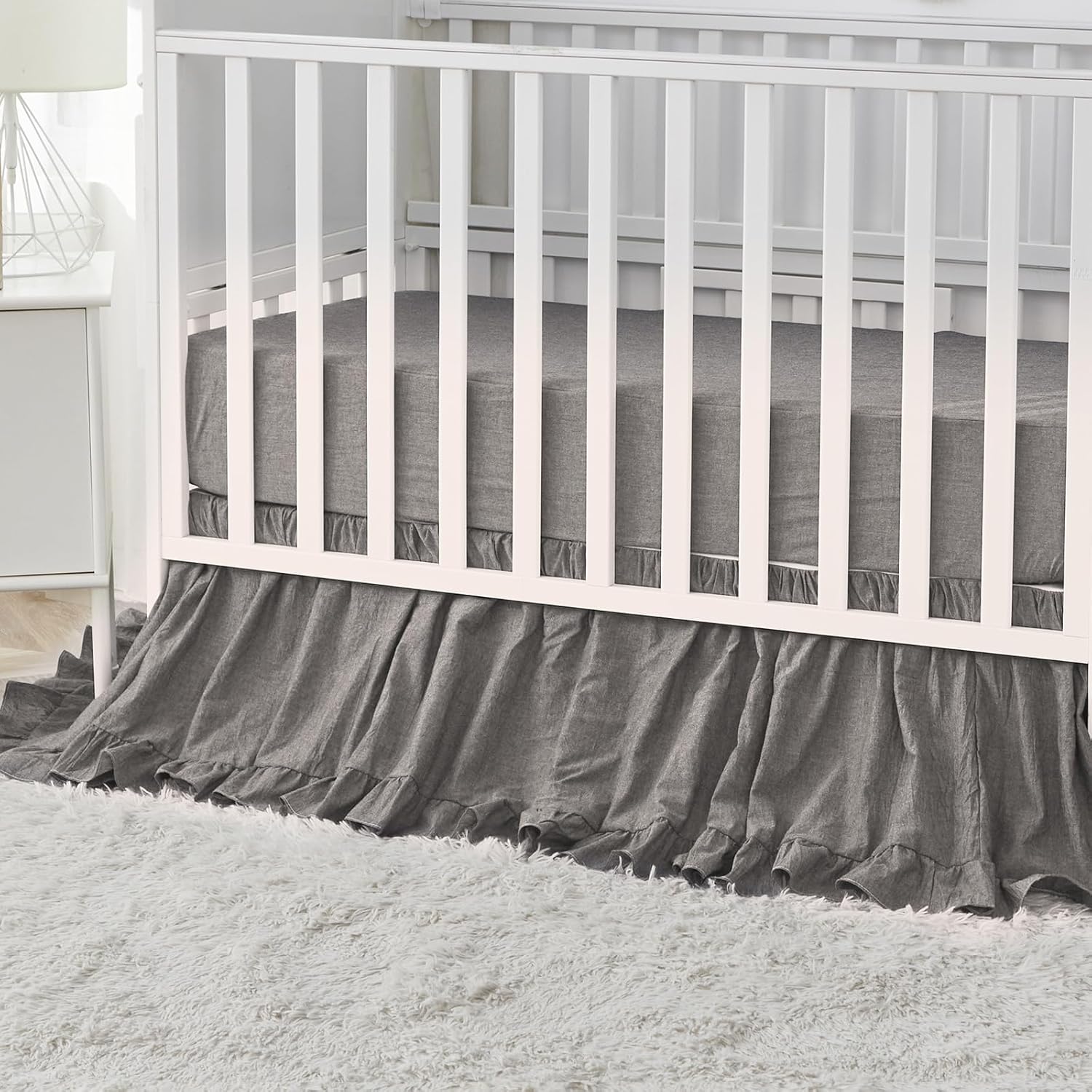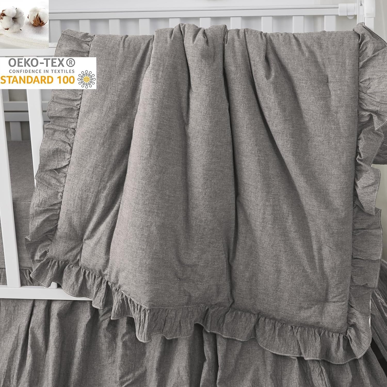 Brandream Baby Crib Bedding Set for Girls Boys Gender Neutral Boho Bohemian Farmhouse Chic Ruffle 6-Piece Nursery Bedding Set - 100% Washed Cotton Gray Grey