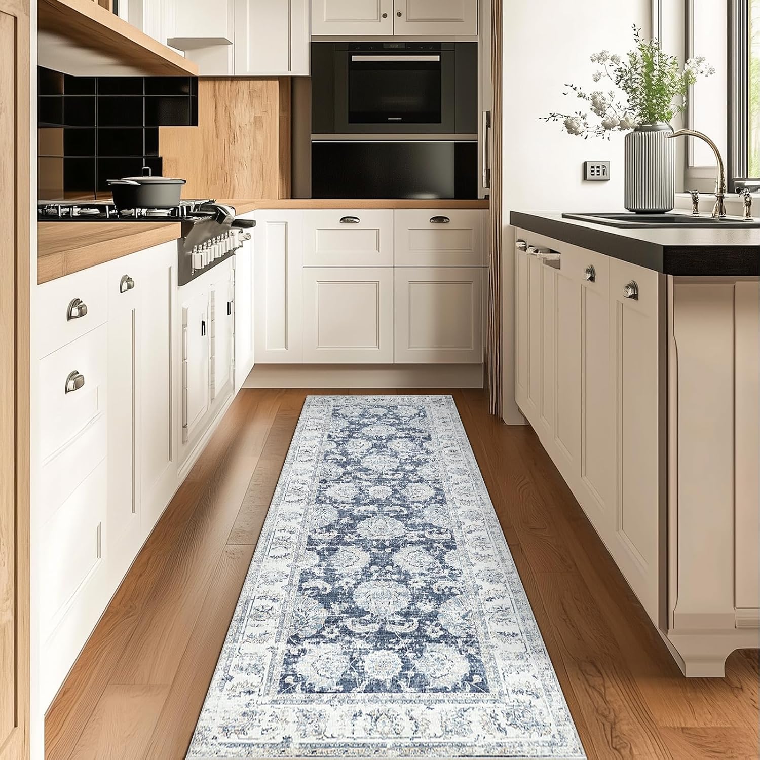 jinchan Long Hallway Runner Rug 2x12 Machine Washable Runner Rug Dark Blue Vintage Floral Design Non-Slip Ultra-Thin for Kitchen Laundry Room Bedroom Farmhouse (2‘x12',Dark Blue)