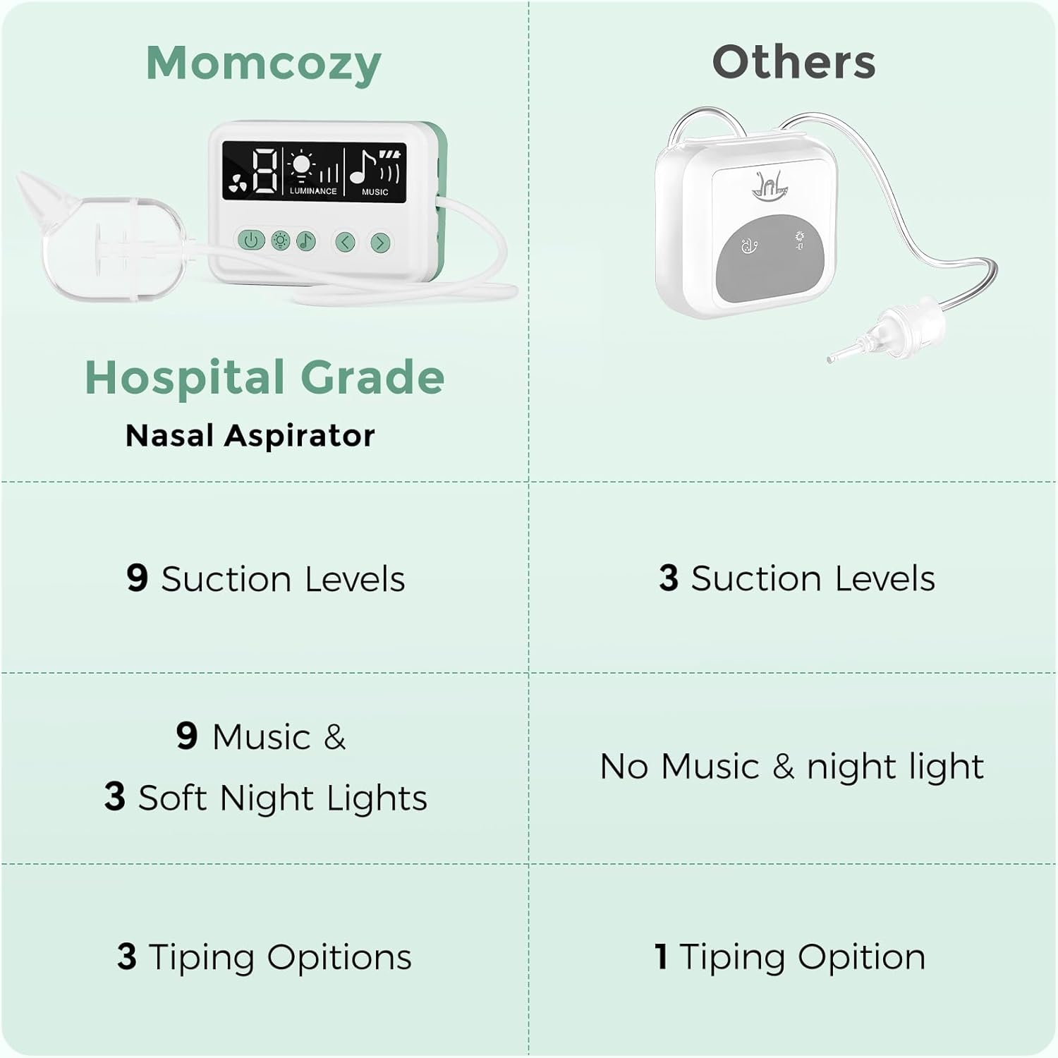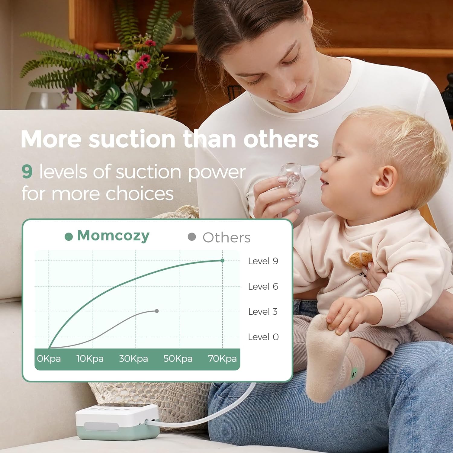 - 【Powerful Yet Gentle Relief for Your Little One】 Experience the difference with the Momcozy electric nasal aspirator for baby! With 9 adjustable suction levels (up to 70 kPa), this baby nose sucker tackles even stubborn congestion effectively, yet remains gentle on delicate noses. Finally, a strong suction nasal aspirator designed with your baby's comfort in mind, helping them breathe easier and rest peacefully.