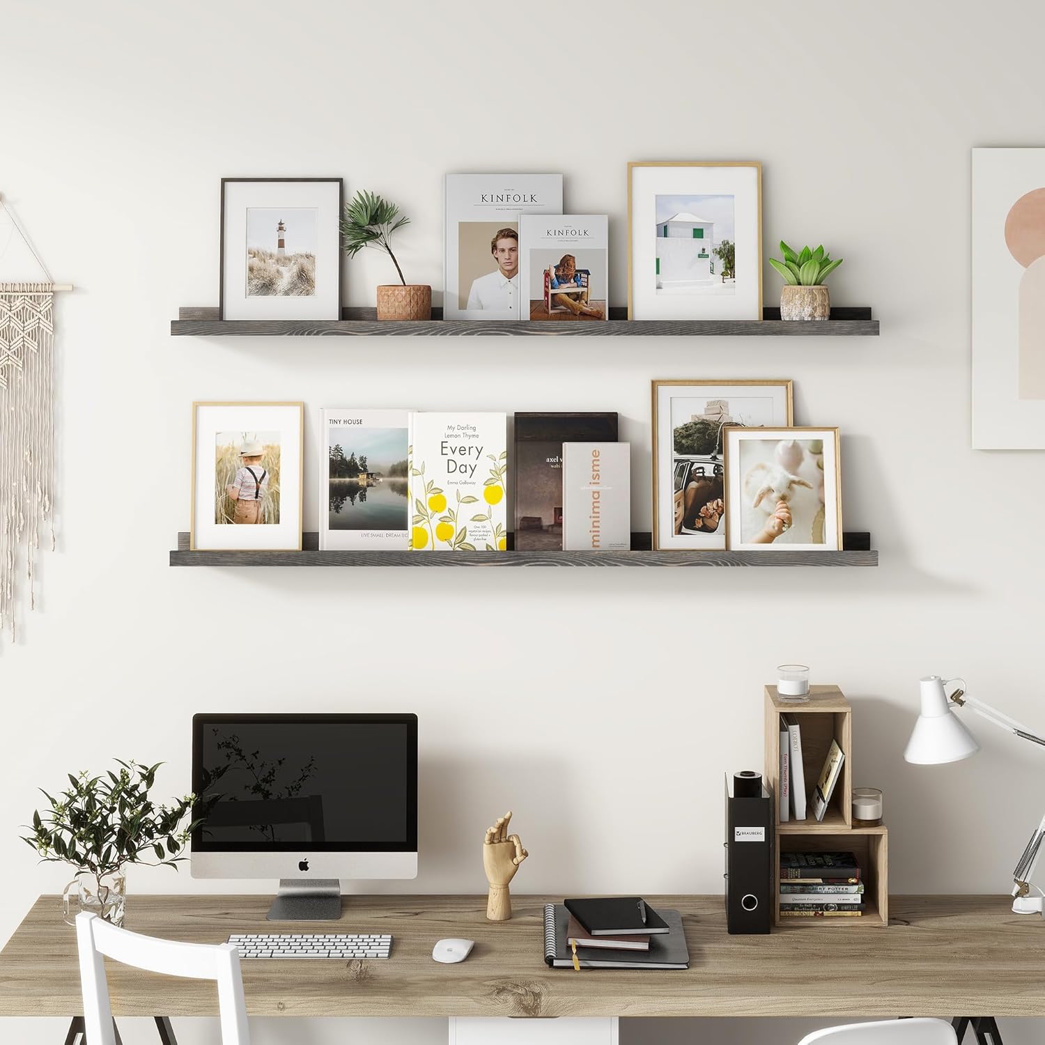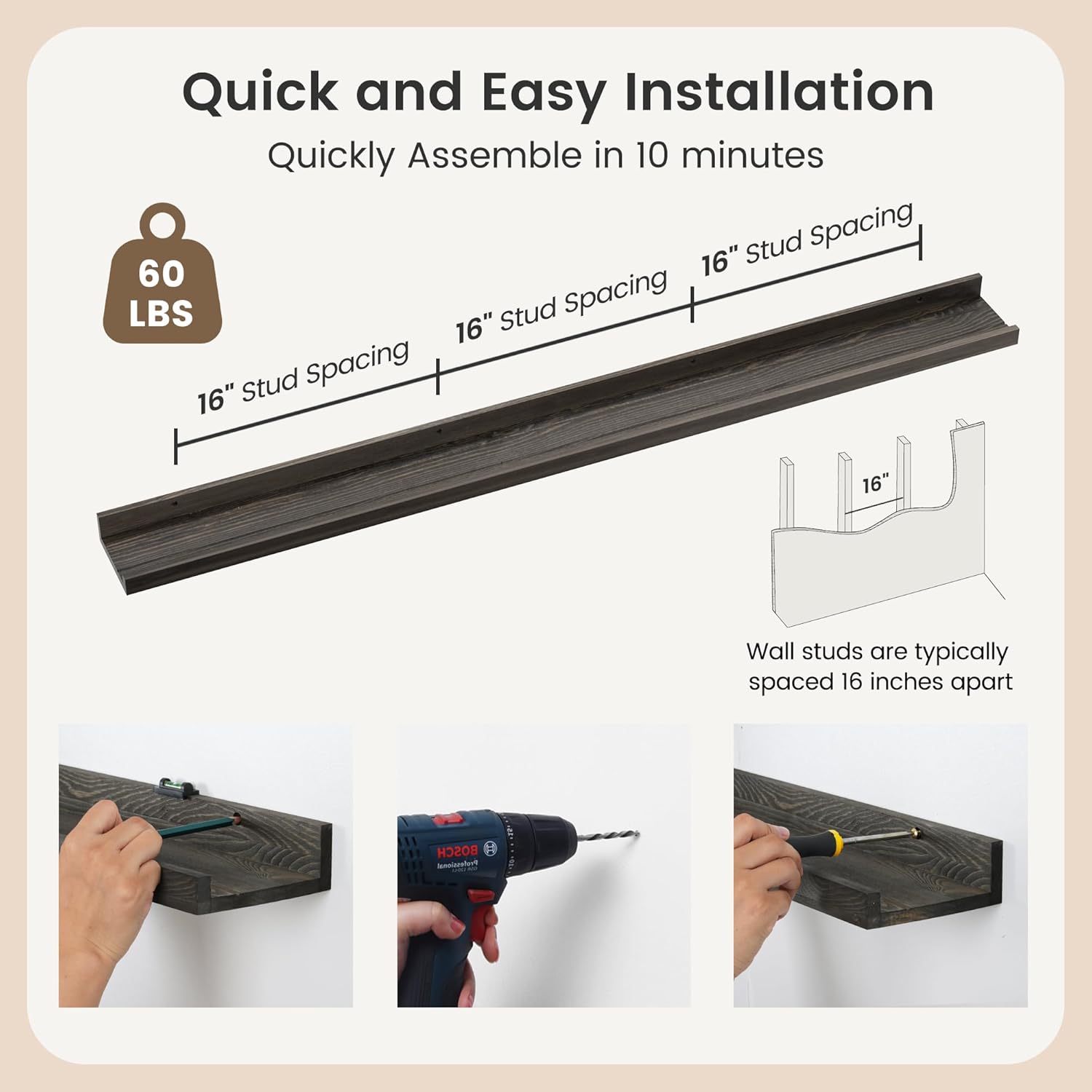 - Easy to Install: You will get a level, screws for the wall, drywall anchors, a detailed installation guide, and two beautiful hand-crafted solid pine wood shelves. With the level, you can make sure your picture ledge shelves are well aligned. Just follow the simple instruction to install the hanging shelves for wall decor within 10 minutes. We add additional screw and anchor to the hardware bag just in case. If you have any questions about our products, please feel free to contact us