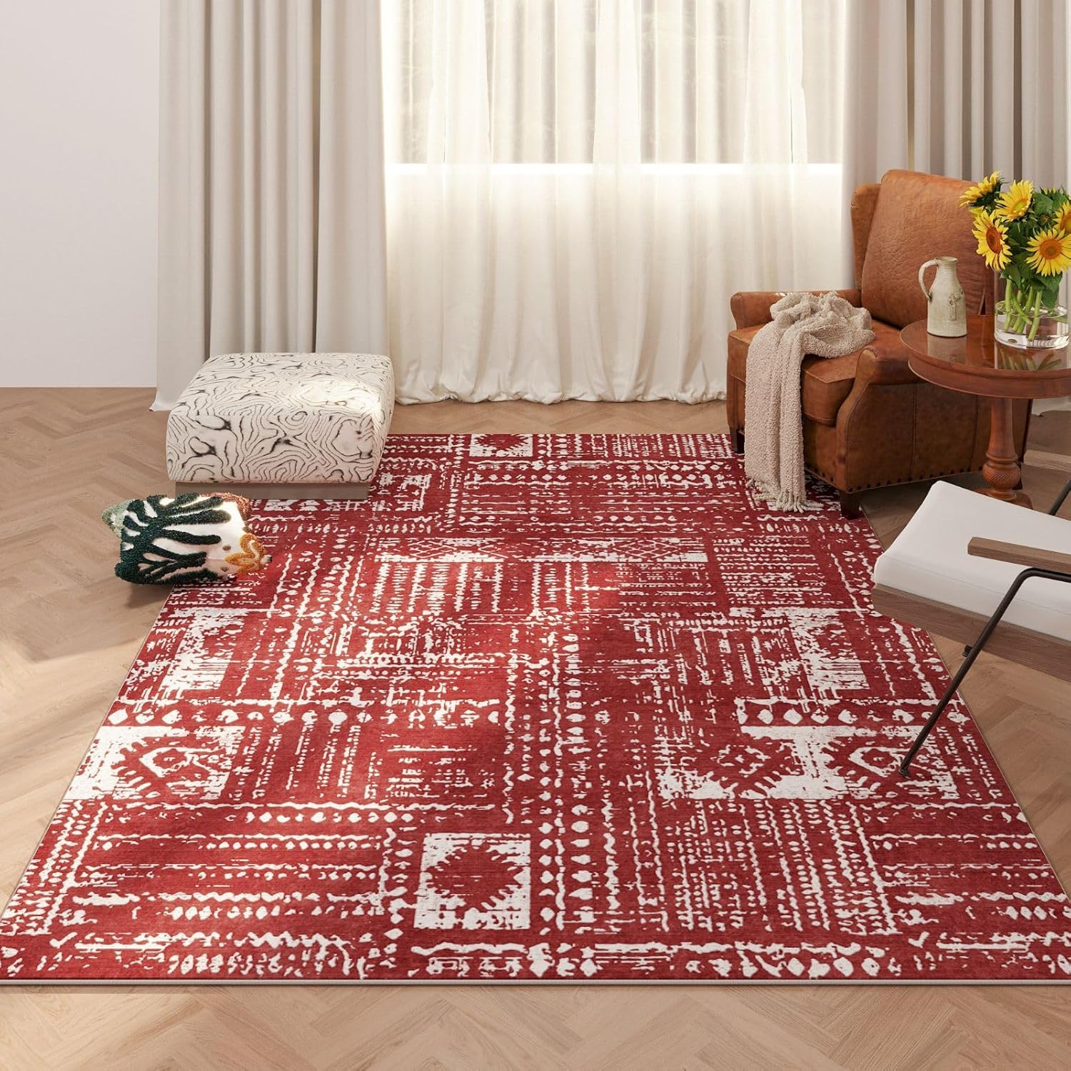 Living Room Rug 5x7 Rug Machine Washable Boho Area Rug Non Slip Moroccan Vintage Low Pile Large Rugs for Living Room, Bedroom, Farmhouse, Dining Room, Kids Playroom(Terracotta)