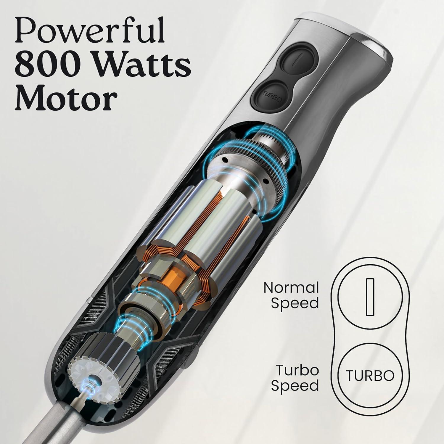 Zulay Immersion Stick Mixer Hand Blender - 800 Watts, Turbo Mode, 5-ft Power Electric Cord, Handheld Portable, Stainless Steel Blades - For Effortless Blending Smoothie, Soup, Baby Food, Puree - Gray