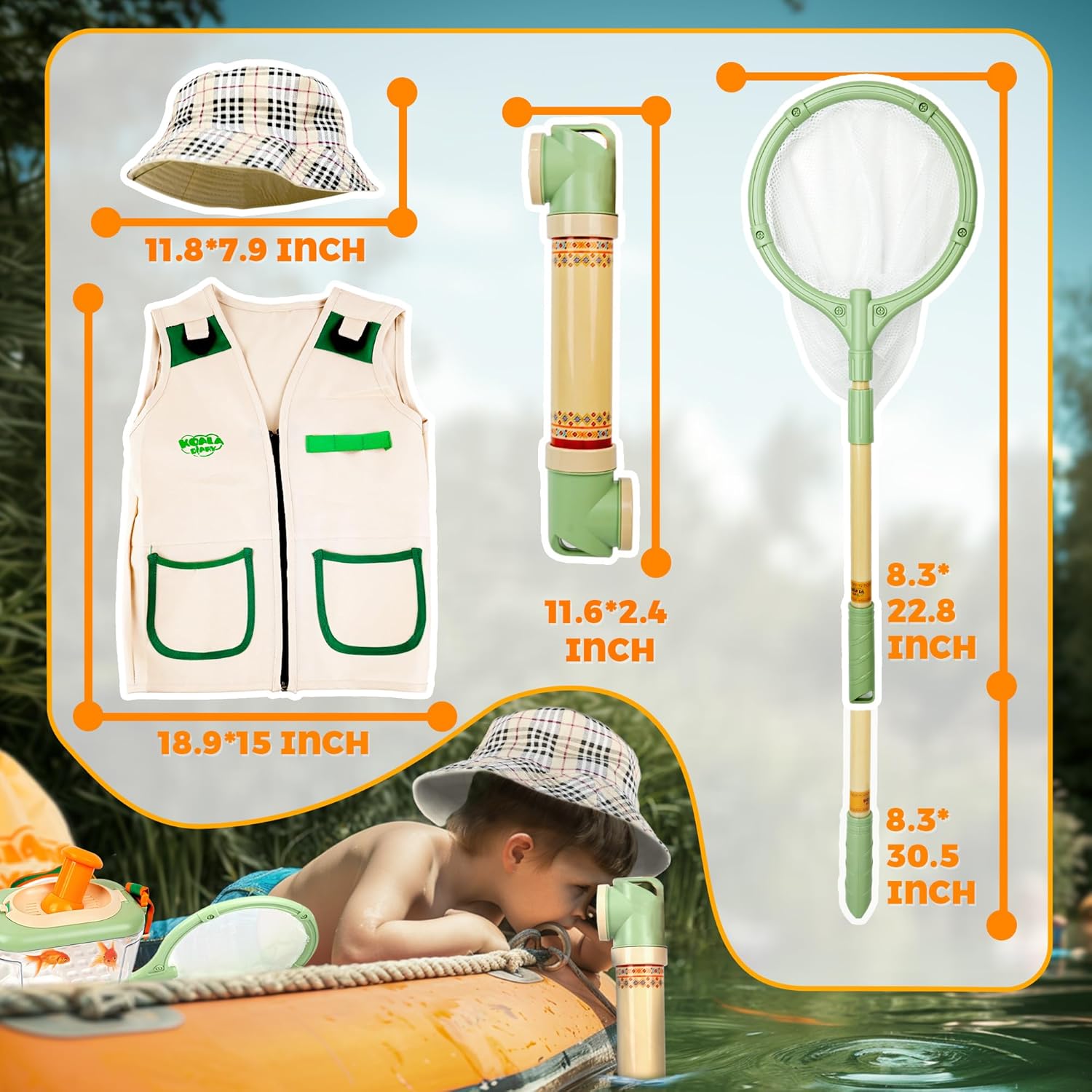 - Complete kids adventure kit - This toddler explorer kit will fulfill kids' needs for outdoor exploration, the kids bug catching kit comes with hat, vest, backpack, periscope, magnifying glass, telescope, flashlight, whistle, trap, goggles, tweezers, short lanyard, long lanyard, hanging rings, cards and more. They can bring the kids camping gear to explore the mysteries of nature